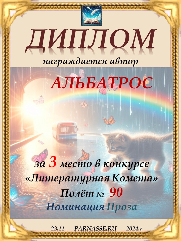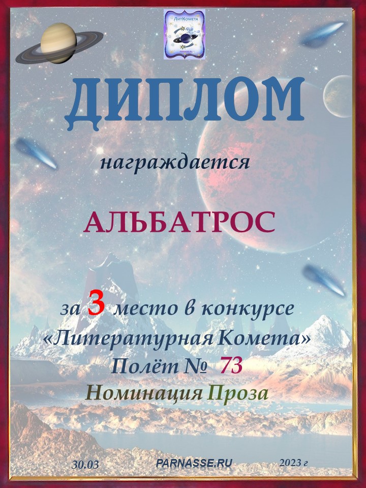 Поздравляю с занятым 3 местом в конкурсе "ЛитКомета-Полёт № 73" - Номинация Проза!