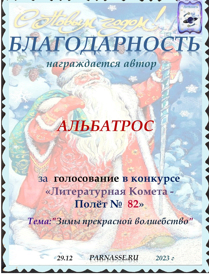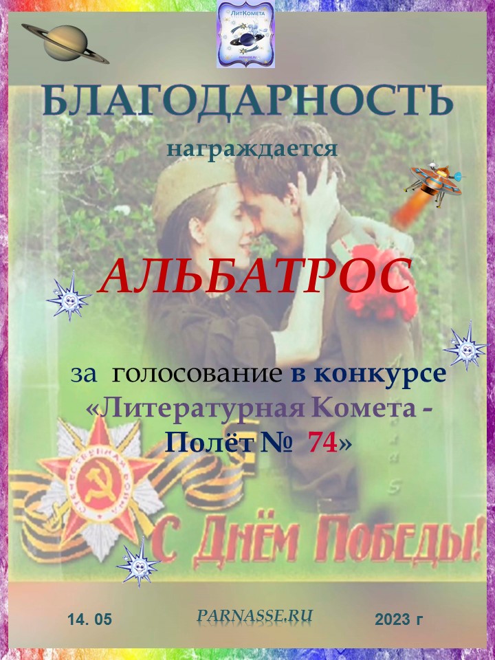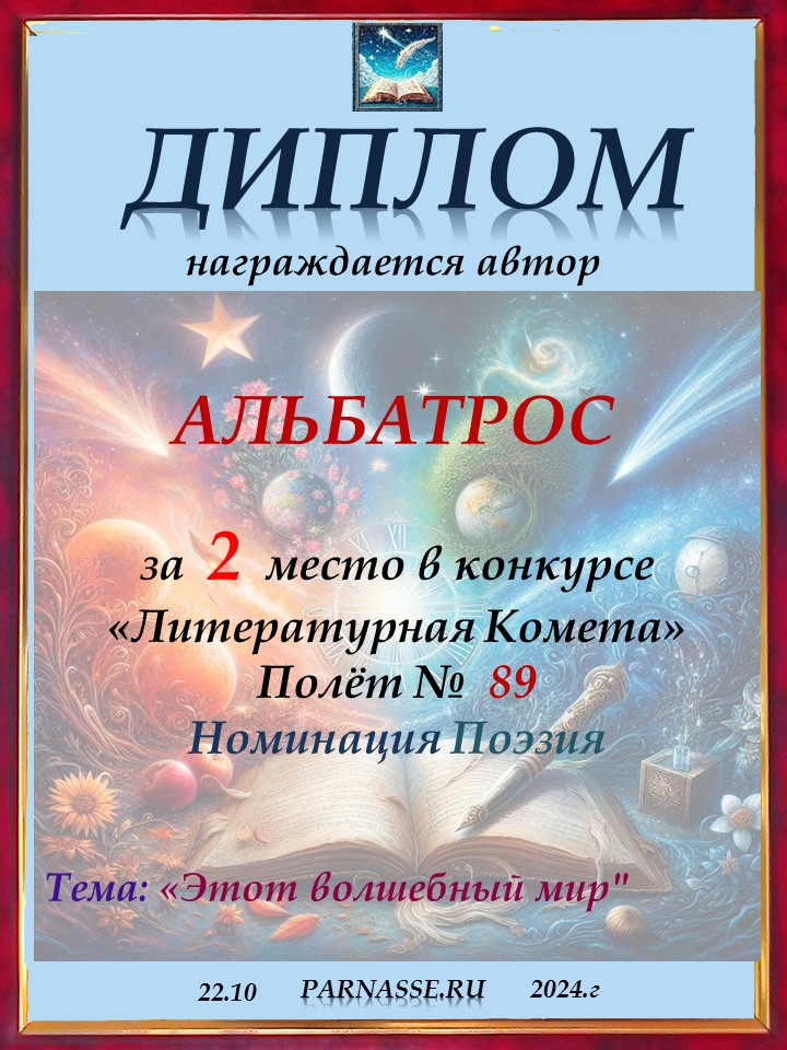 Поздравляю с занятым 1 местом в конкурсе "Литературная Комета - Полёт № 59" Номинации Поэзия!