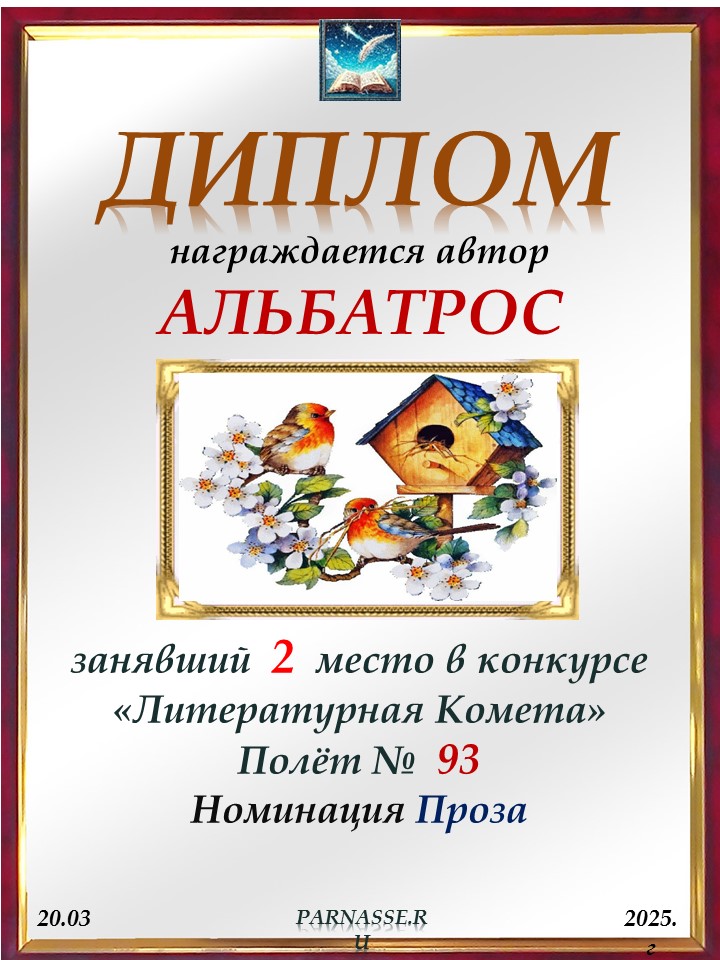 ![]() Медаль за 2 место в конкурсе "ЛитКомета - Полёт № 93" - Номинация Проза