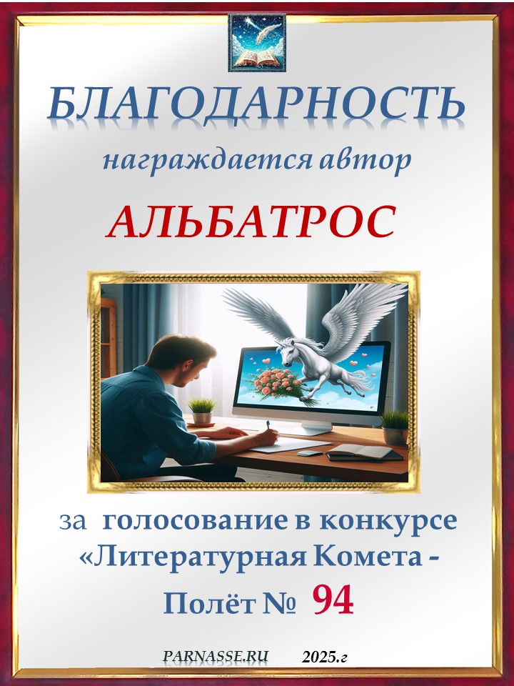 ![]() Медаль читателя в конкурсе "ЛитКомета - Полёт № 94"