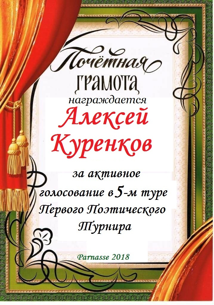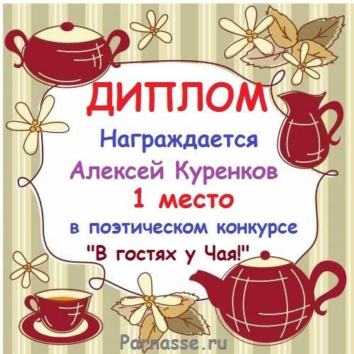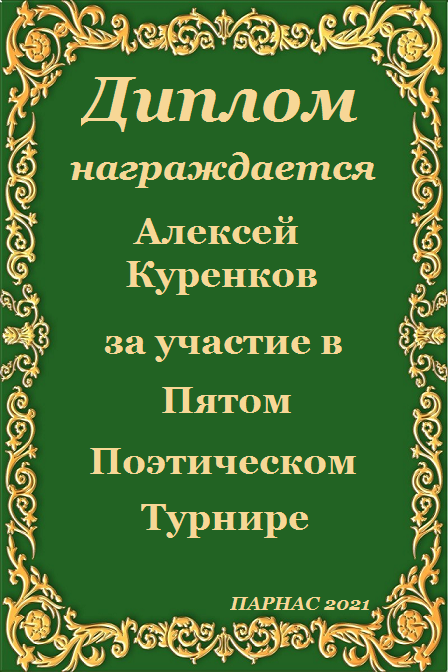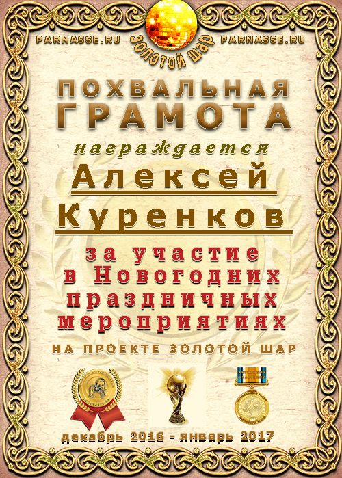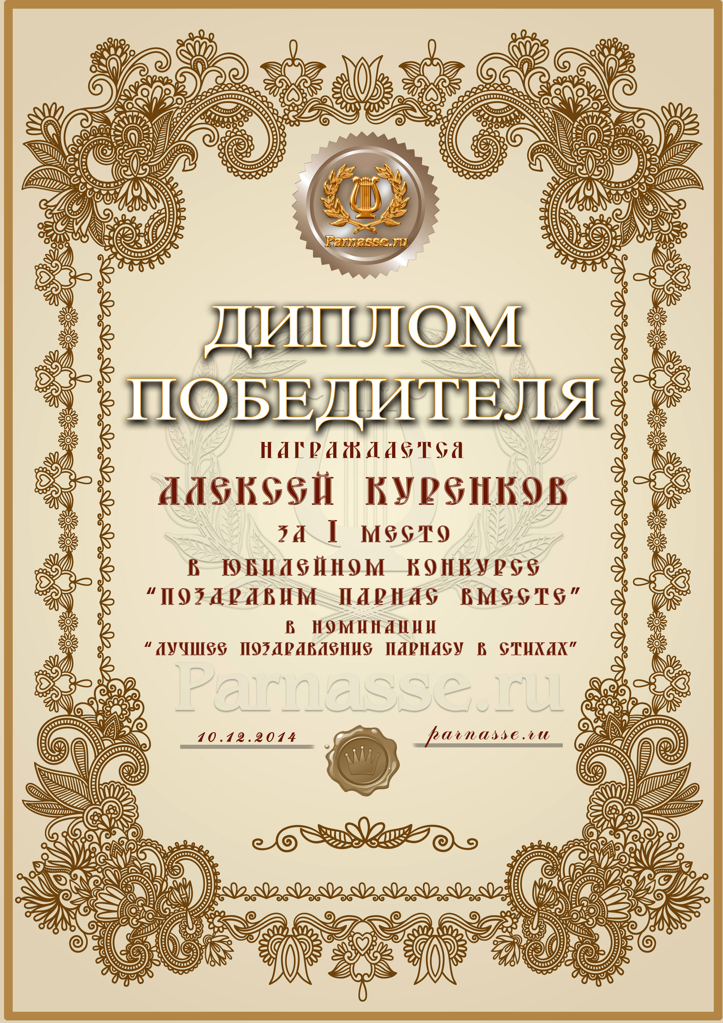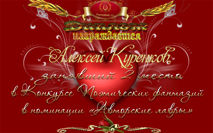 За неугасающую и неисчерпаемую творческую активность, постоянный контакт с Музой и признание сообществом "Парнасцев".От всей души желаем Вам, Алексей, здоровья, любви, успехов, благополучия, удачи и творческого вдохновения!