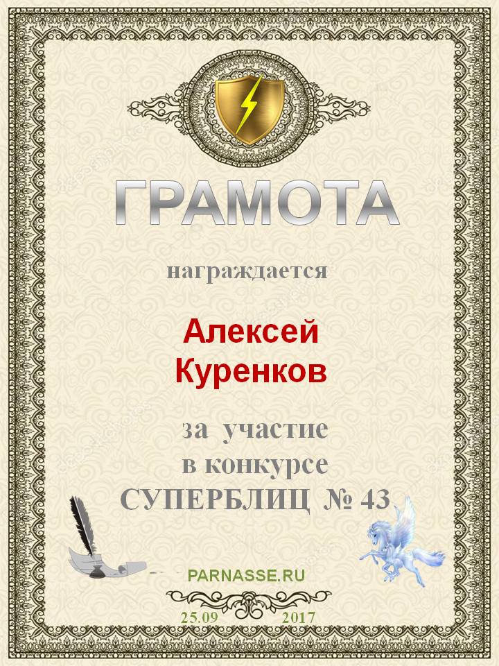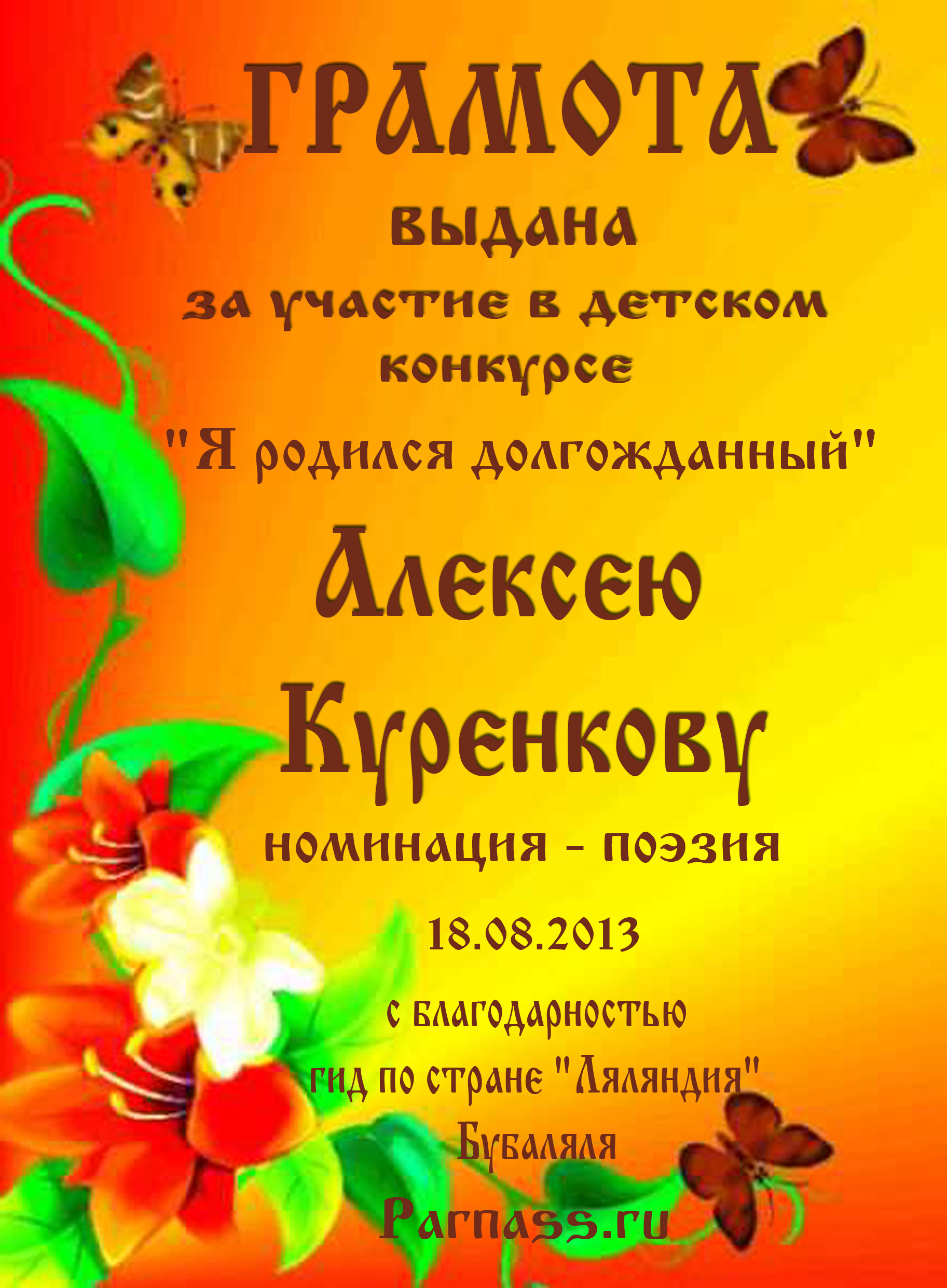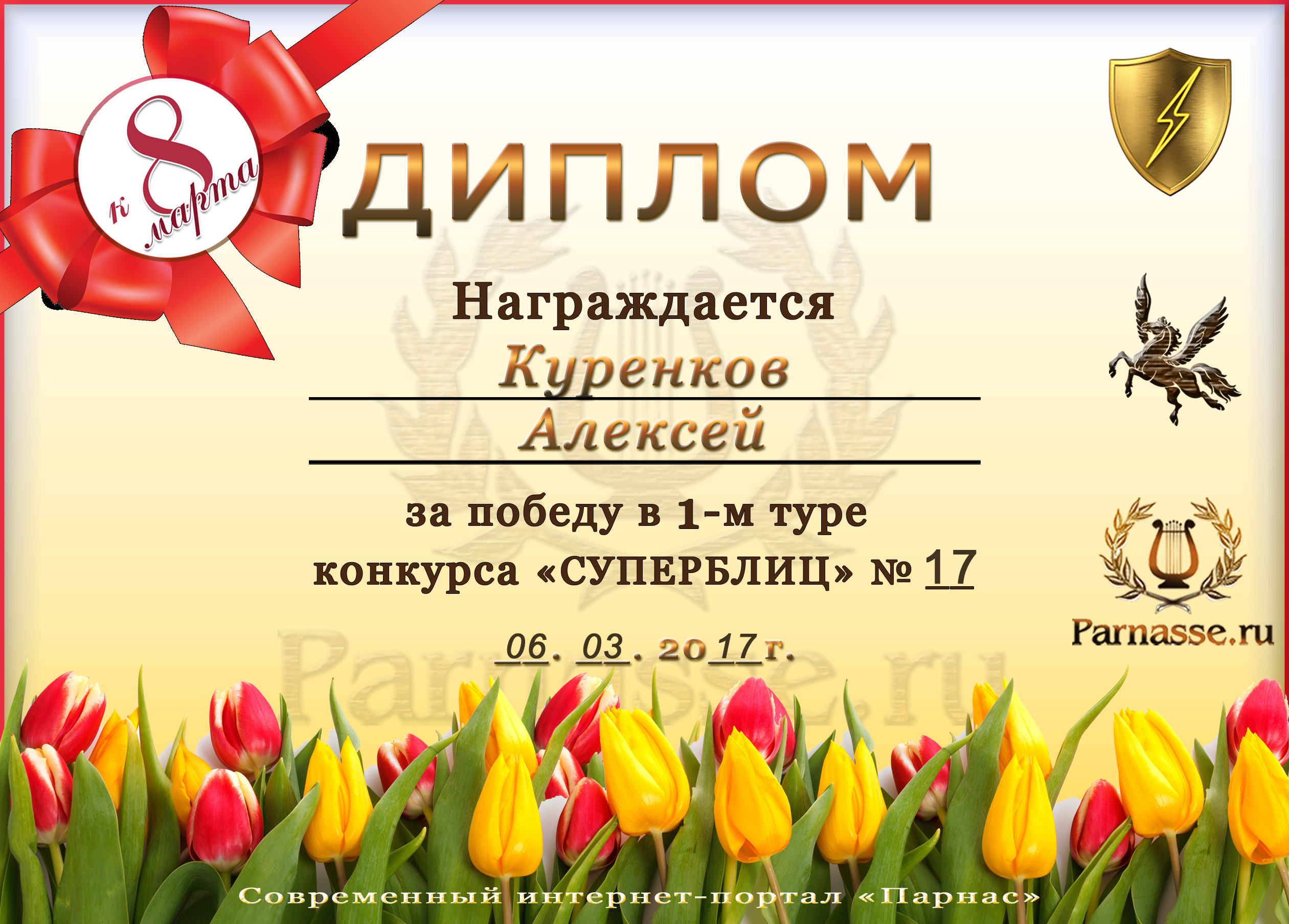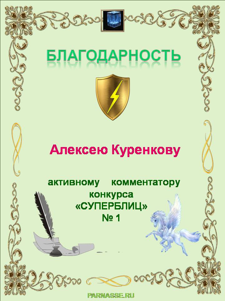 За неугасающую и неисчерпаемую творческую активность, постоянный контакт с Музой и признание сообществом "Парнасцев".От всей души желаем Вам, Алексей, здоровья, любви, успехов, благополучия, удачи и творческого вдохновения!
