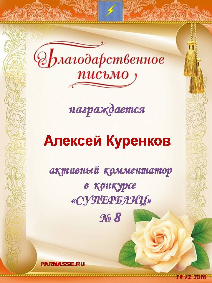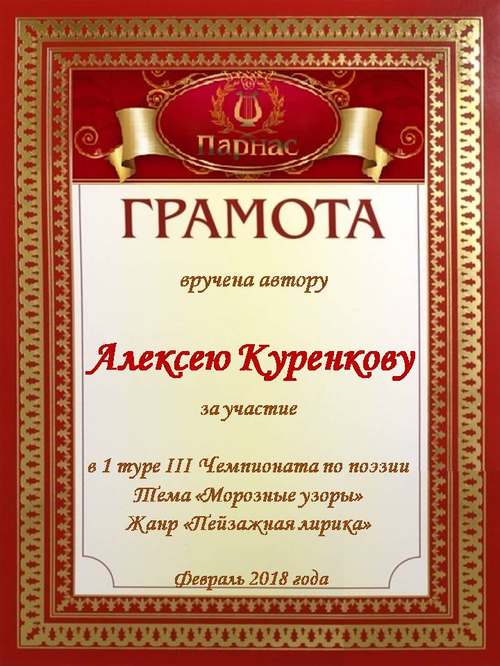 Уважаемый Алексей!Спасибо Вам большое за высокопрофессиональное, объективное судейство конкурсов на Парнасе!