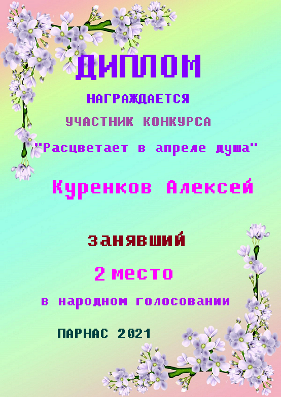 Второе место в судейском голосовании по итогам конкурса "Расцветает в апреле душа"