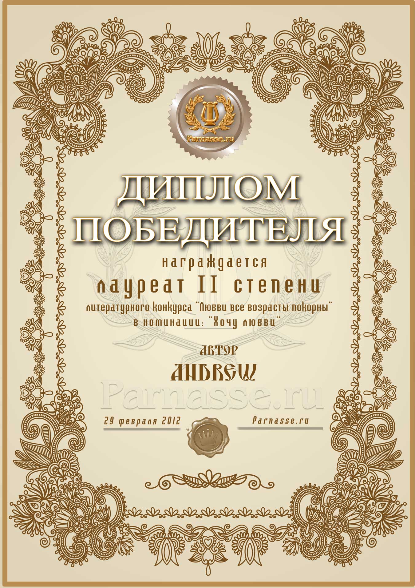 ![]() ![]() ![]() Лауреат II степени литературного конкурса «Любви все возрасты покорны»!