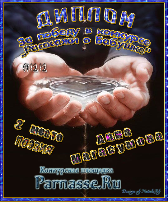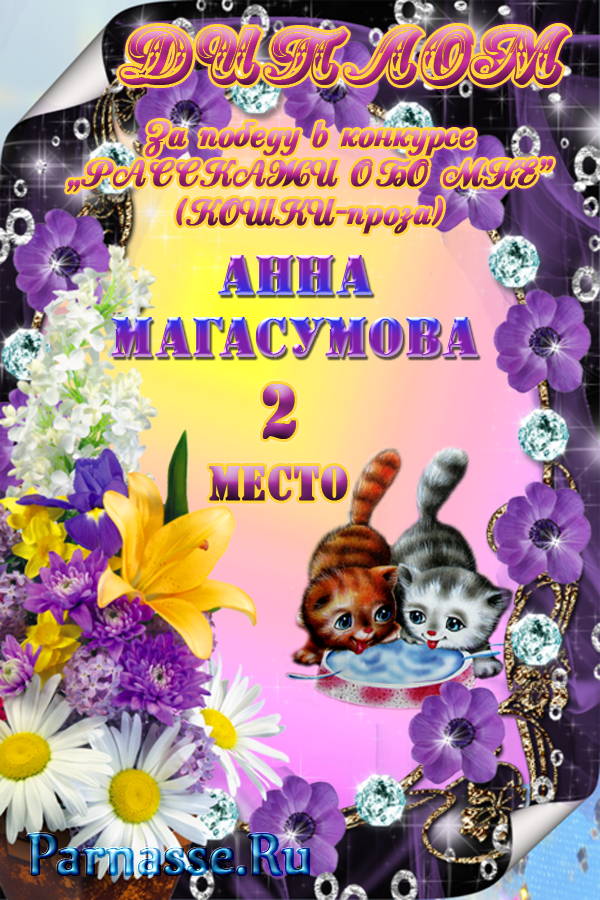 Победителю музыкально-литературного конкурса "Ах, Мама, Мамочка, родная!" Номинация "Рассказы-сказки о Мамочке". Поздравляем! Счастья Вам и всего замечательного. Желаем хорошего настроения, вдохновения и удачи во всем. Спасибо за участие в конкурсе. С Уважением, Администрация.