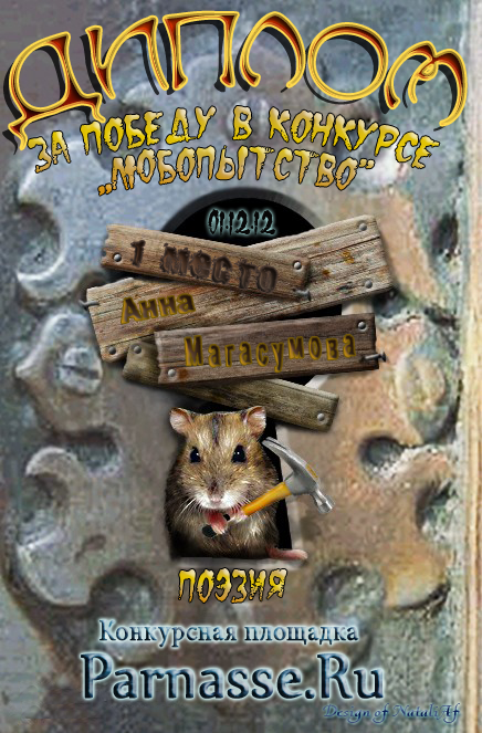 Первое место в праздничном конкурсе "Поздравим Парнас вместе!", в номинации "Лучшее поздравление Парнасу в прозе". Мы в восторге от Вашего блестящего прозаического поздравления и желаем Вам здоровья, счастья, удачи, неизменно бодрой и яркой Музы, а также самых высоких результатов в творчестве! Надеемся, что вместе с Вами мы встретим еще не одну годовщину "Парнаса". Спасибо Вам большое, пусть Вам всегда сопутствует успех в жизни! Произведение "Полное собрание сочинений"