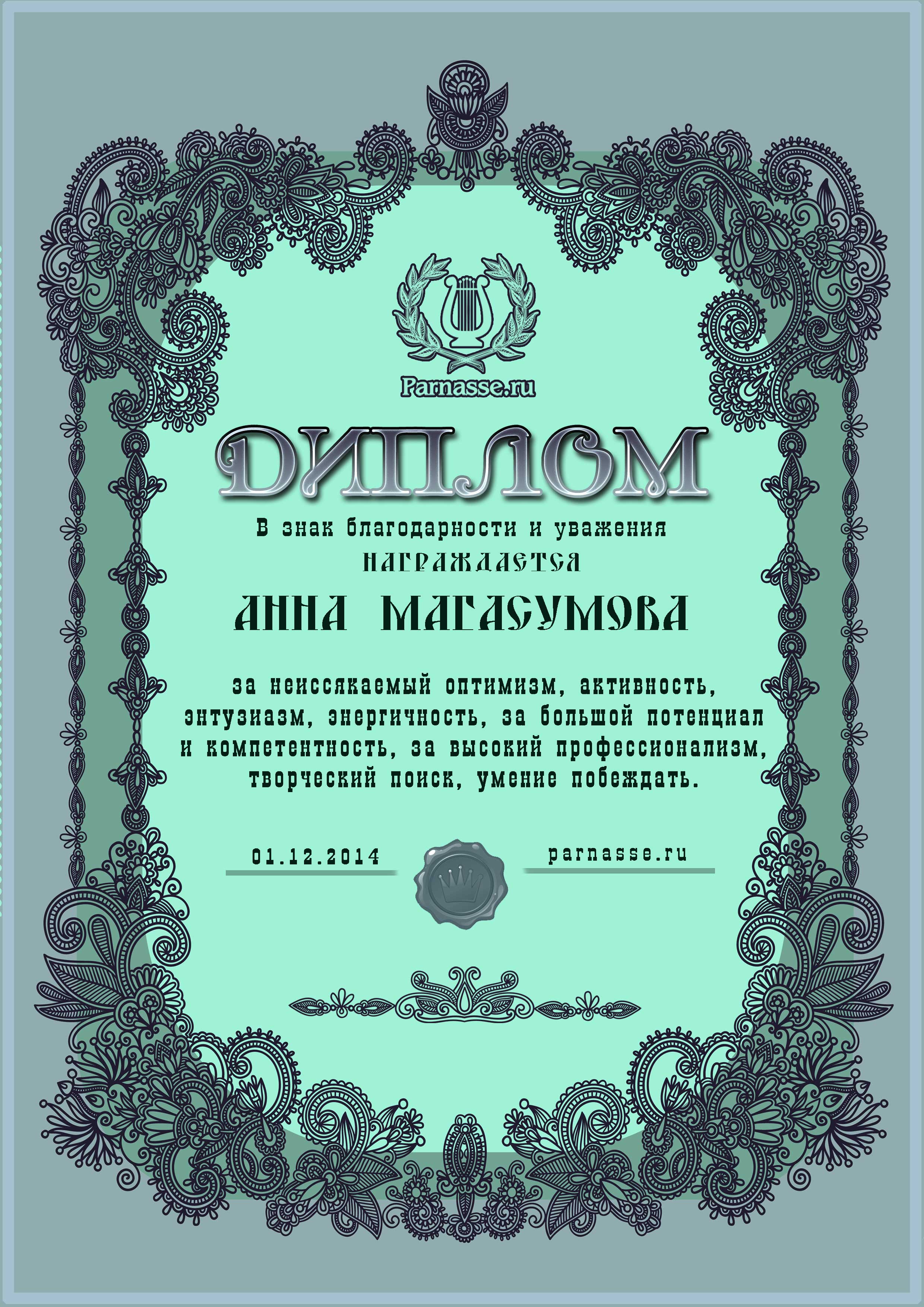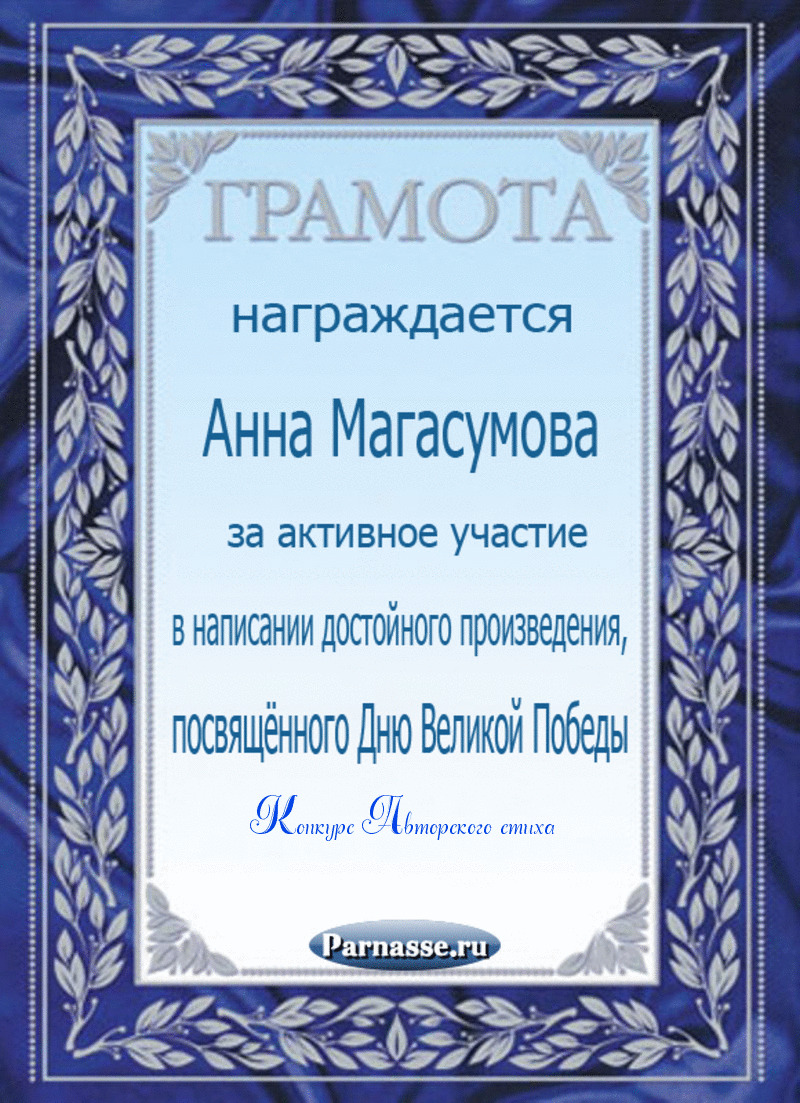 За неугасающую и неисчерпаемую творческую активность, постоянный контакт с Музой и признание сообществом "Парнасцев".От всей души желаем Вам, Анна, здоровья, любви, успехов, благополучия, удачи и творческого вдохновения!