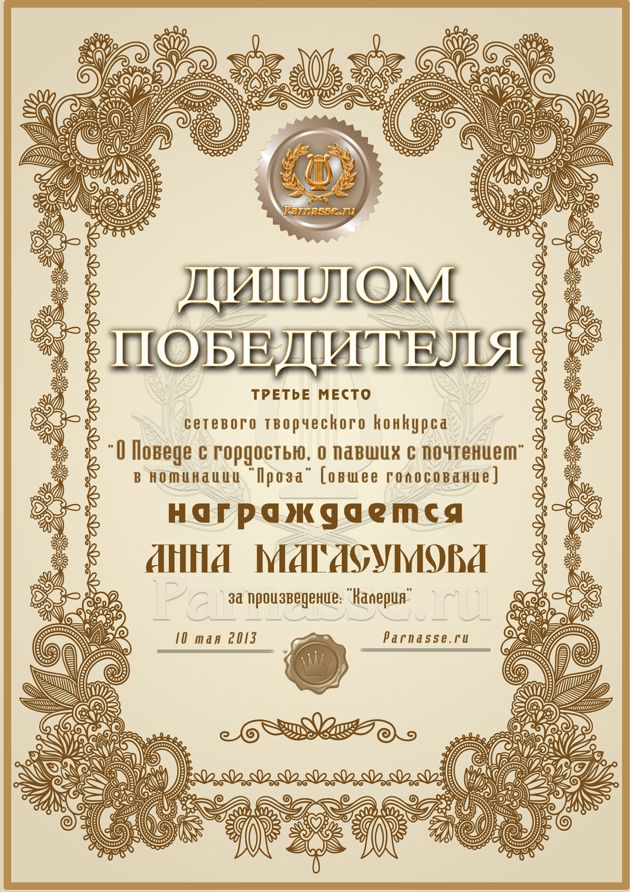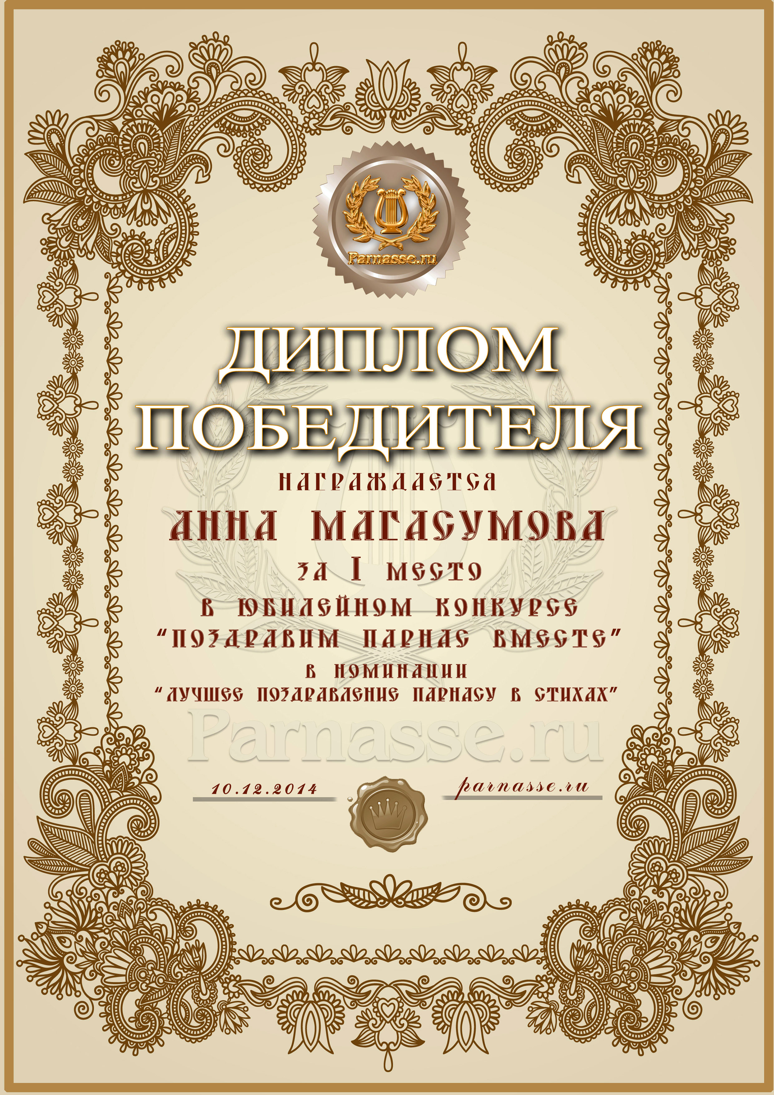 Диплом Победителя за 1 место в праздничном конкурсе "Поздравим Парнас с трёхлетием вместе!"