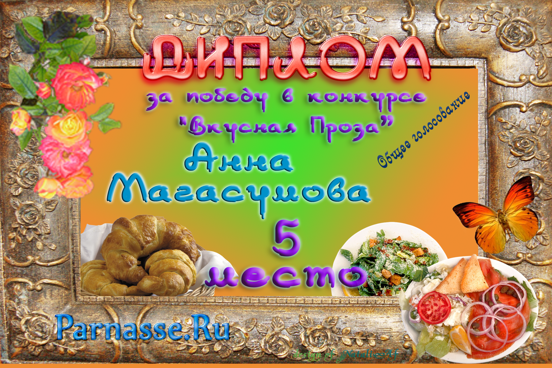 Уважаемая Анна!От всего сердца поздравляем Вас с блестящей ПОБЕДОЙ в номинации «Вкусная ПРОЗА», во "Вкусном конкурсе"