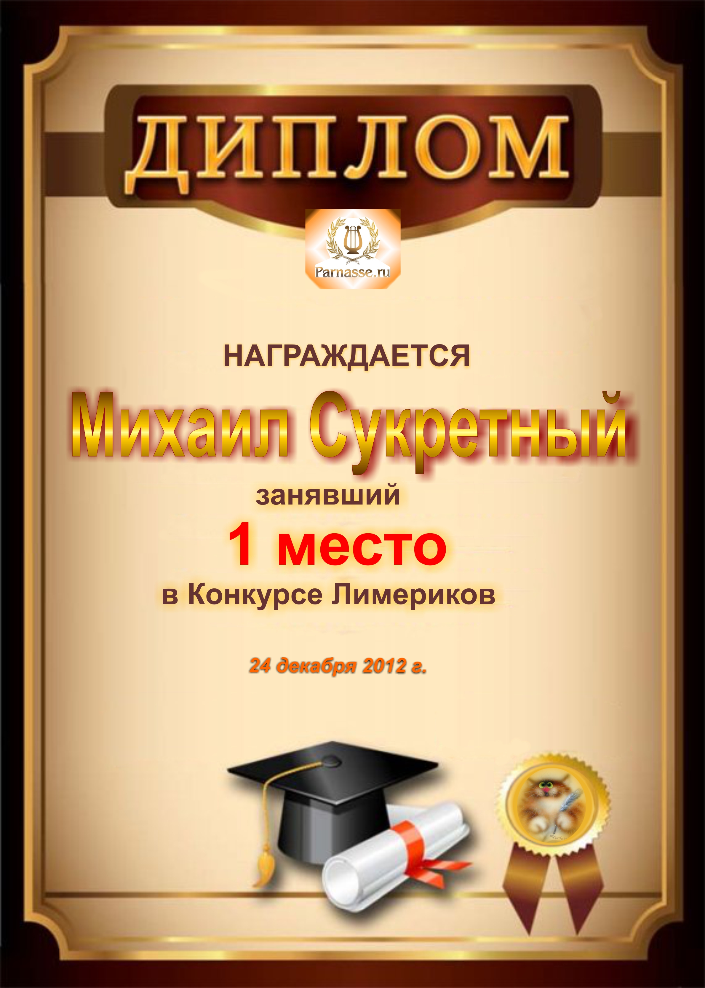 Похвальная грамота за 4 место в конкурсе лимериков № 24 (12.11.2012 г.)