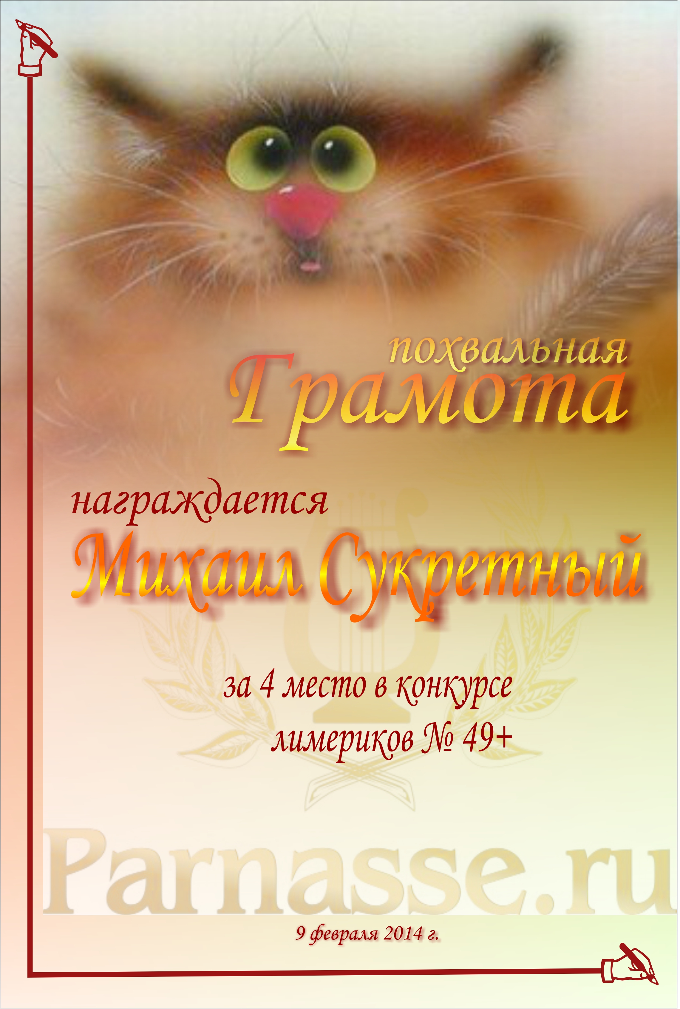 Похвальная грамота за активное участие в конкурсе лимериков № 49+ (9.02.2014 г.)