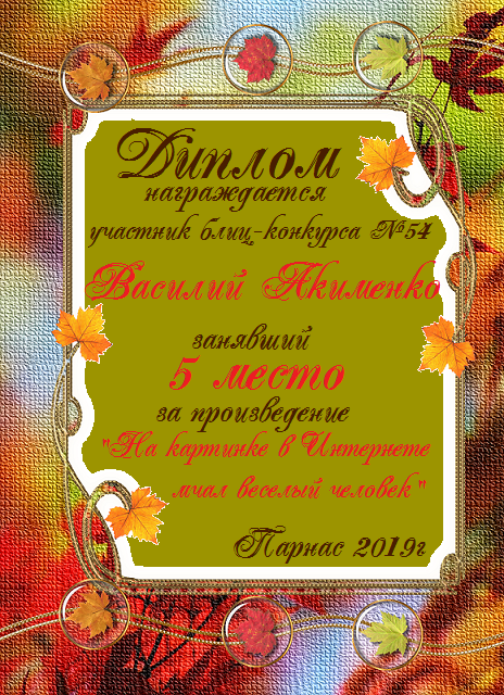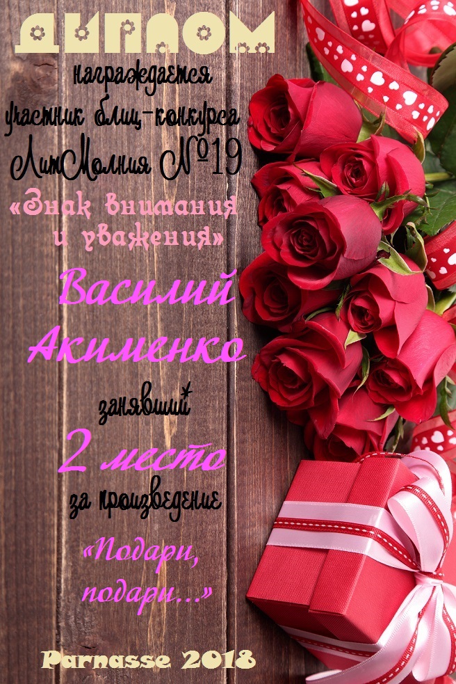 Первое место в праздничном конкурсе "ПОЗДРАВИМ ПАРНАС ВМЕСТЕ!", в номинации "Лучшее стихотворное поздравление Парнасу". Позвольте от всей души выразить Вам благодарность за прекрасные поэтические слова поддержки, самые тёплые пожелания нашему Парнасу и пожелать Вам новых побед на литературном поприще, успехов в жизни и всех Ваших начинаниях! Будьте счастливы, здоровы, пусть удача не покидает Вас ни на минуту и от всей души СПАСИБО! Оставайтесь с нами и мы будем вновь и вновь встречать Дни рождения "Парнаса" в одной дружной, душевной компании! Произведение "С трёхлетием!"