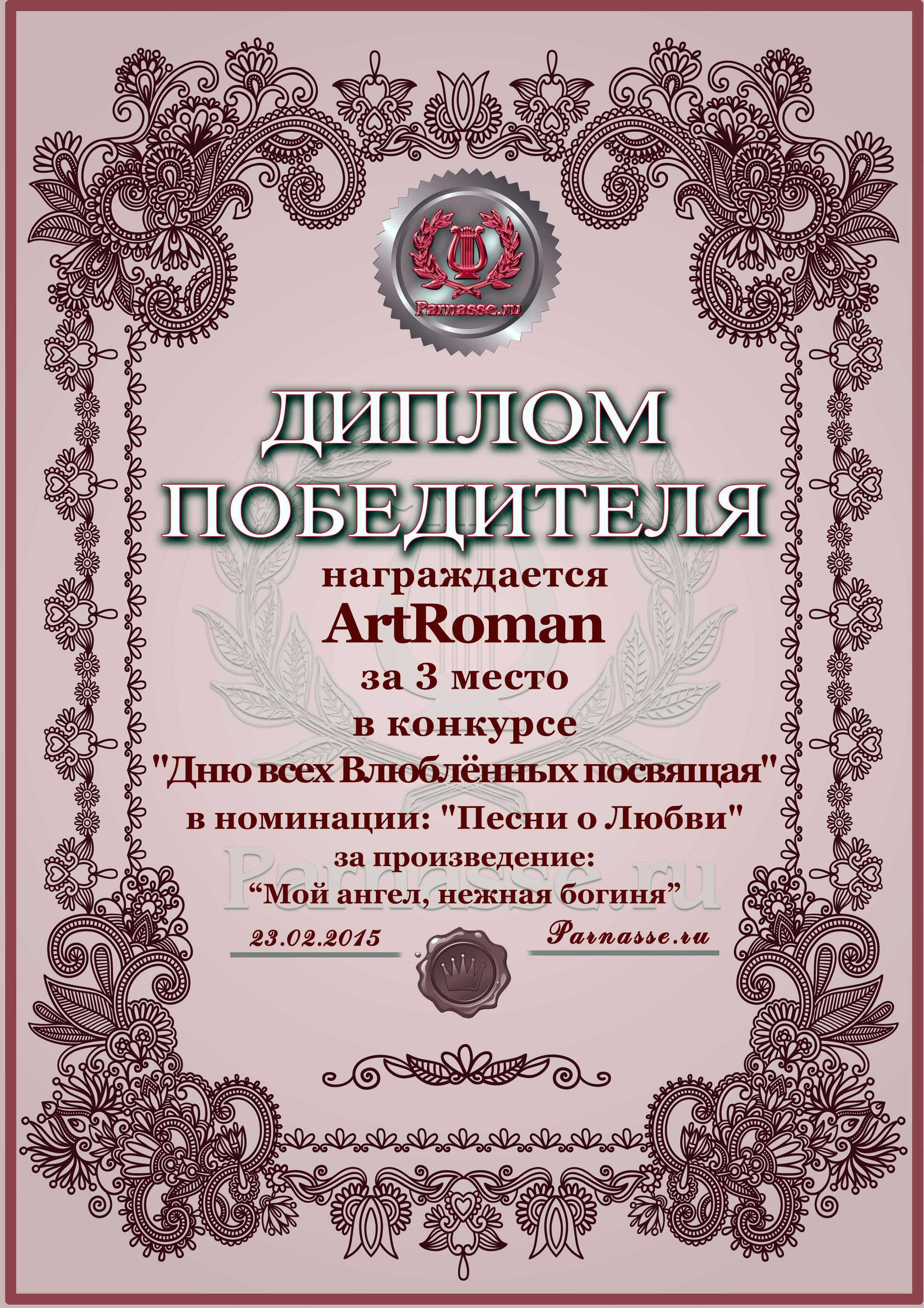 Третье место в конкурсе "Дню всех Влюблённых посвящая", песенная номинация, народное голосование, музыкальное сопровождение песни "Мой ангел, нежная богиня". Поздравляем!