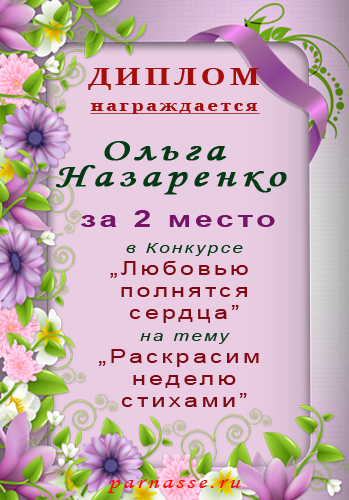 За 2 место в Конкурсе "Любовью полнятся сердца" на тему "Раскрасим неделю стихами"
