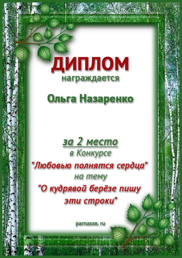 За 2 место в Конкурсе "Любовью полнятся сердца" на тему "О кудрявой берёзе пишу эти строки"