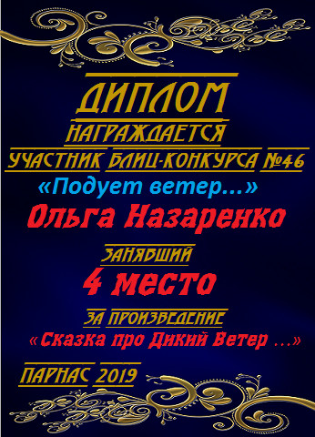 Четвёртое место в Блиц-конкурсе №46 «Подует ветер...» за произведение «Сказка про Дикий Ветер и Нежную Берёзу». Поздравляем!