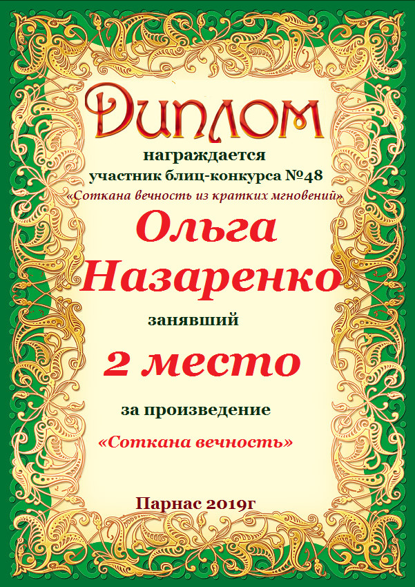 Второе место в Блиц- конкурсе №48 «Соткана вечность из кратких мгновений» за произведение «Соткана вечность». Поздравляем!