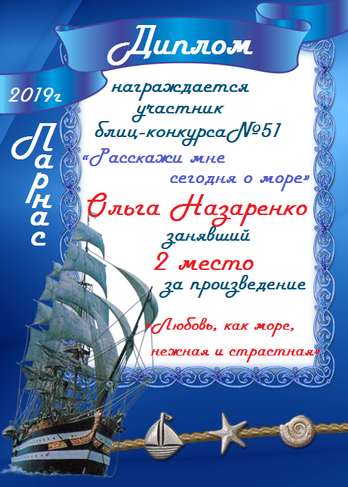 Второе место в Блиц- конкурсе №51 «Расскажи мне сегодня о море» за произведение «Любовь, как море, нежная и страстная». Поздравляем!
