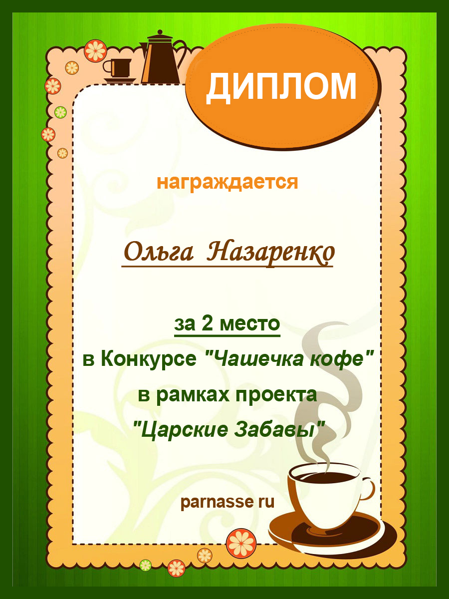За 2 место в Конкурсе "Чашечка кофе" в рамках проекта "Царские Забавы"