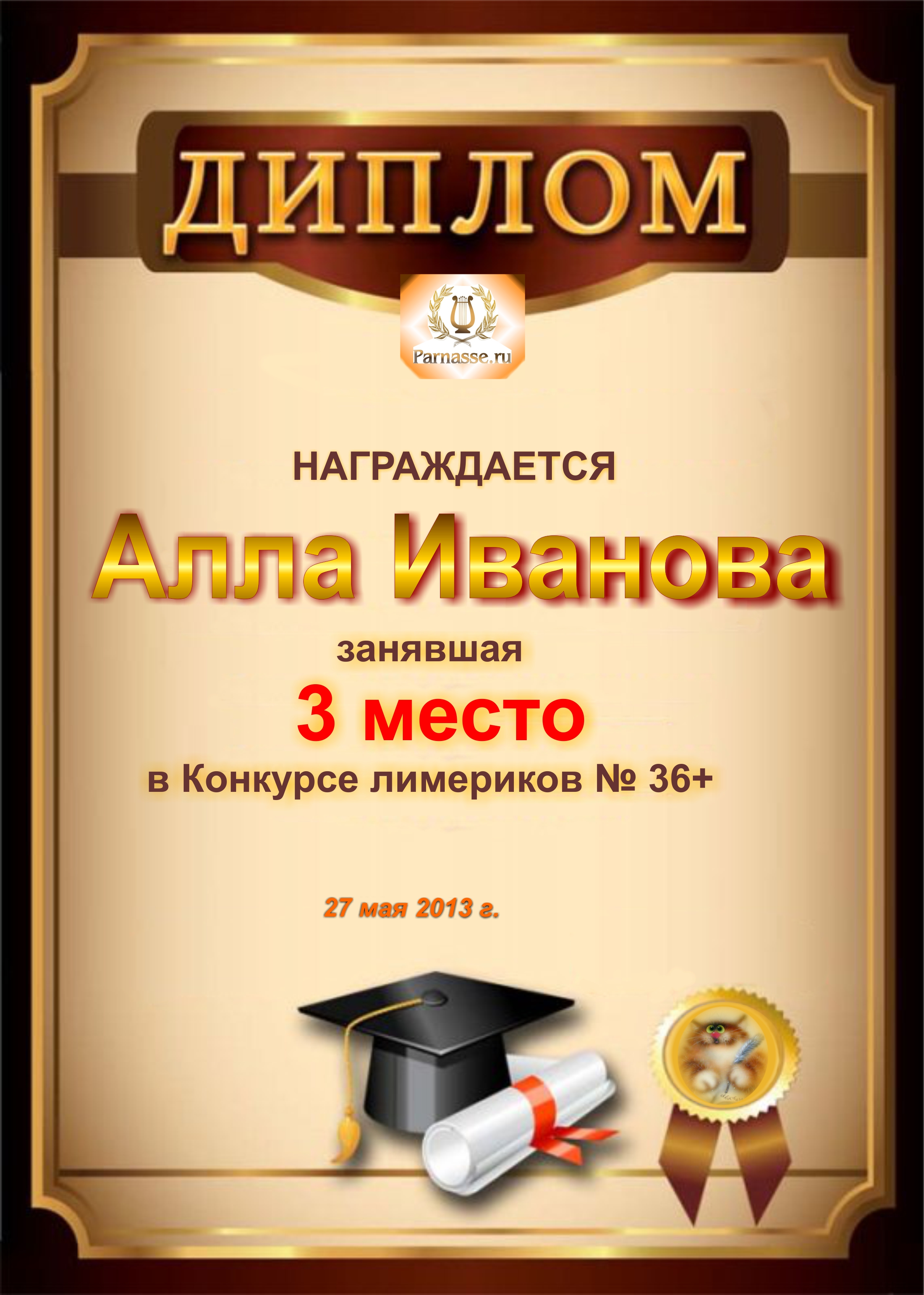 Диплом за победу и 3 место в дополнительной номинации конкурса лимериков № 39+ (29.07.2013 г.)