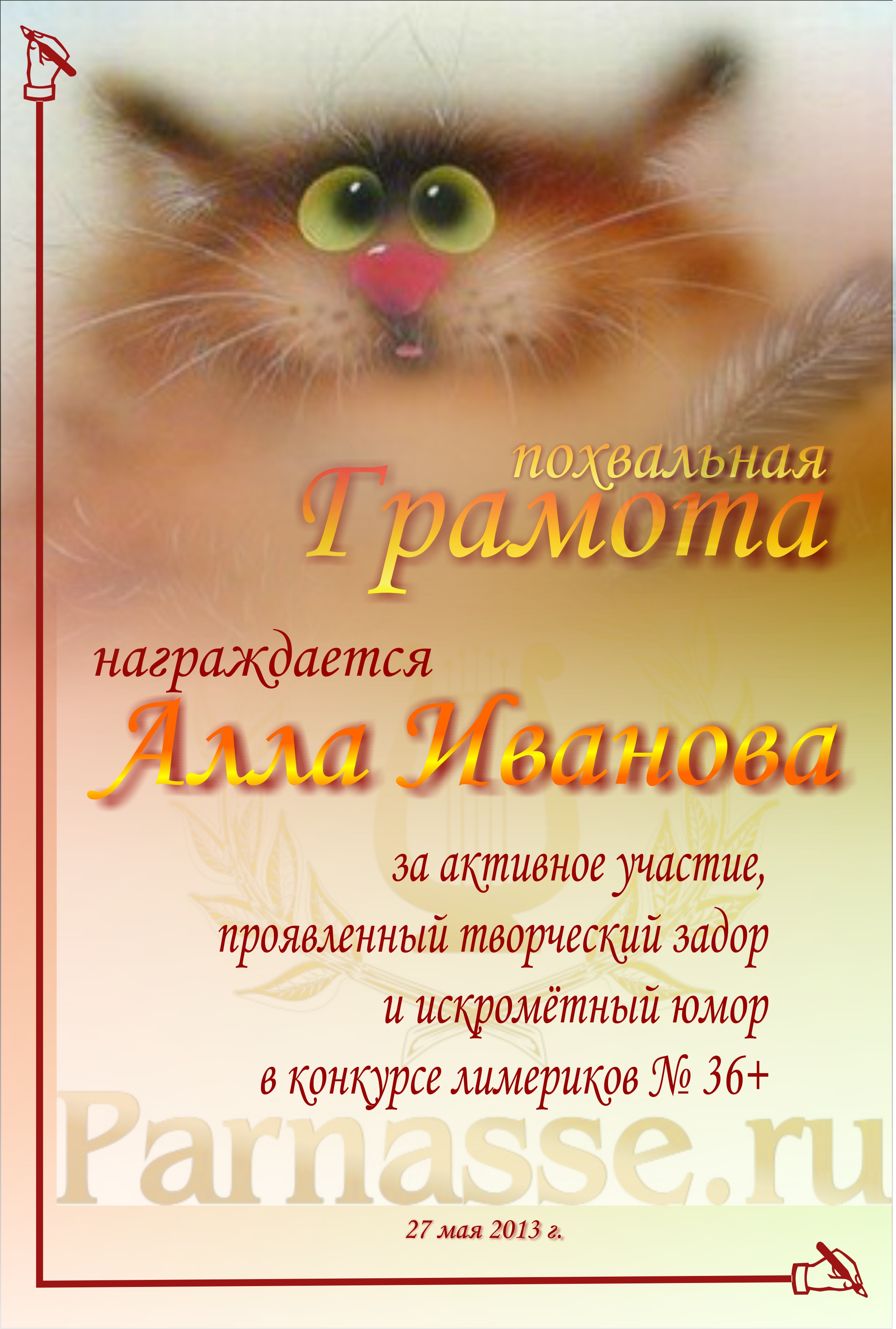 Похвальная грамота за 4 место в конкурсе лимериков № 36+ (27.05.2013 г.)