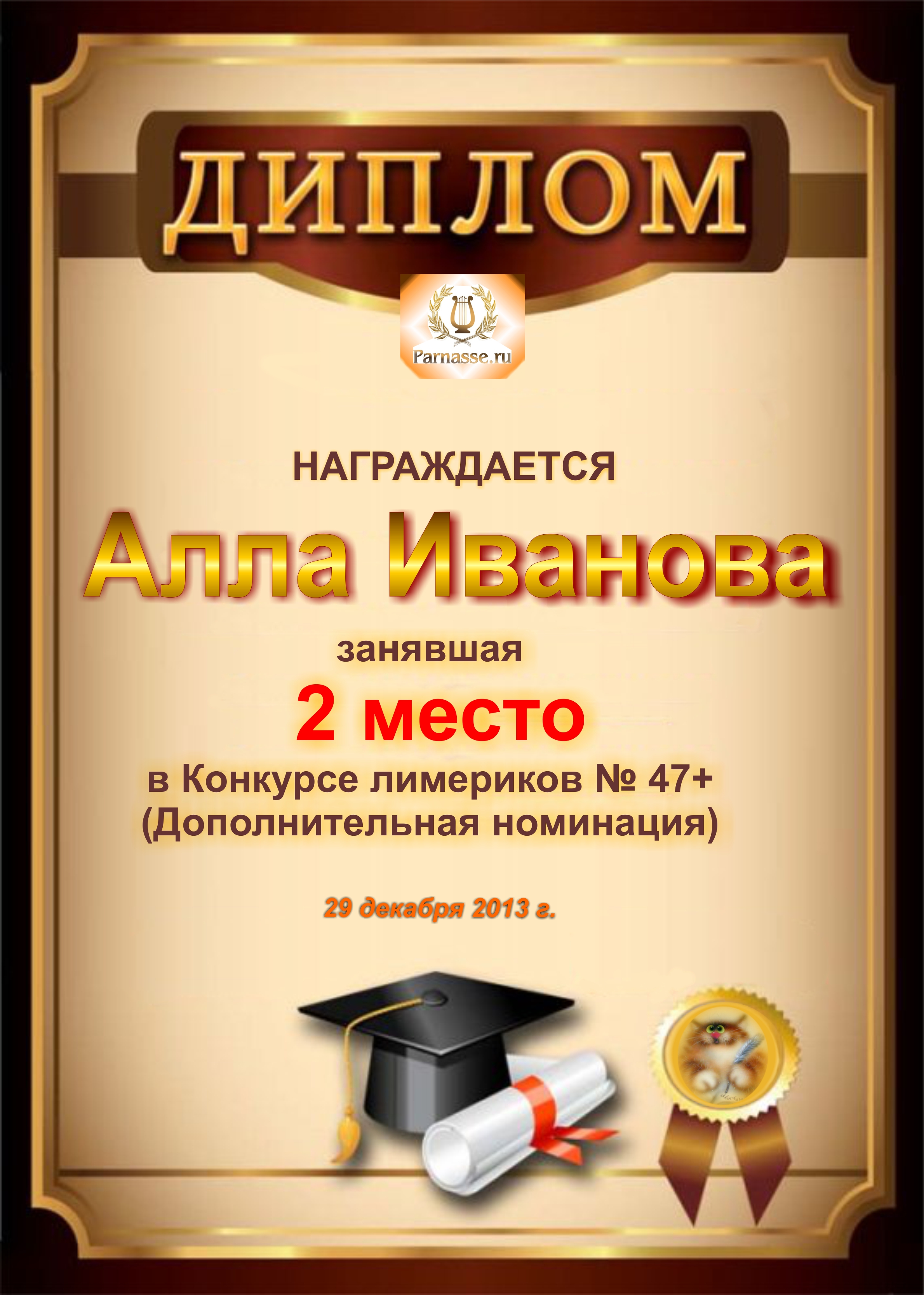 Диплом за победу и 2 место в дополнительной номинации конкурса лимериков № 47+ (29.12.2013 г.)