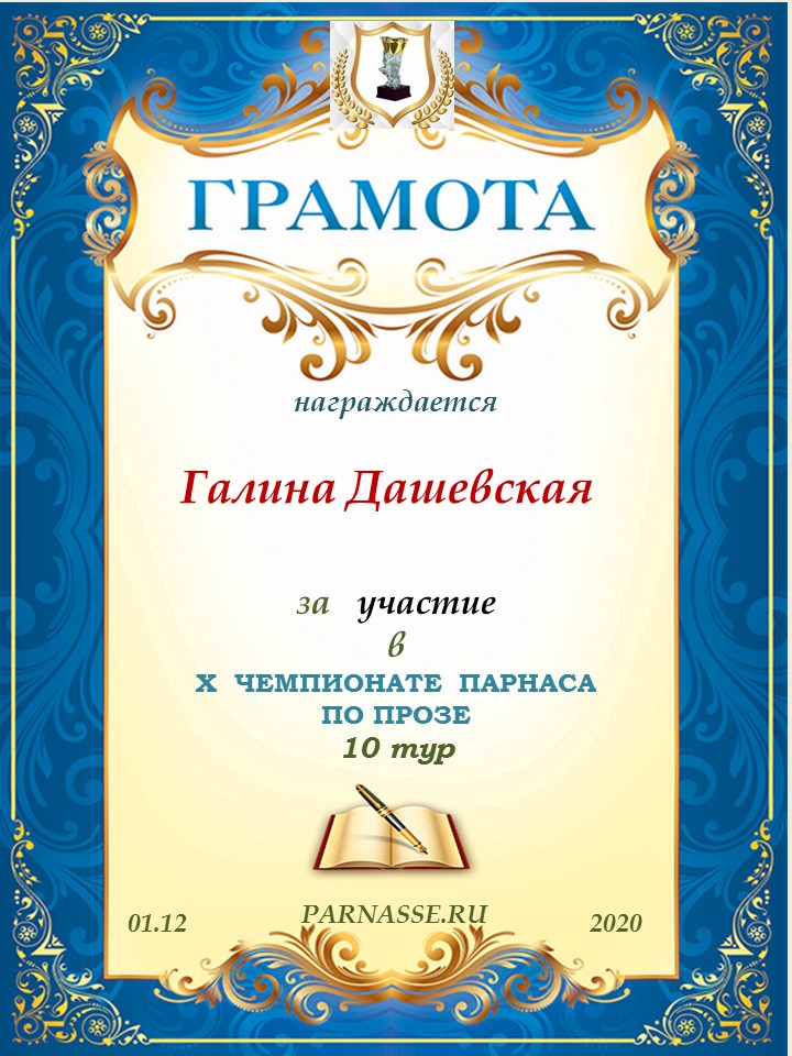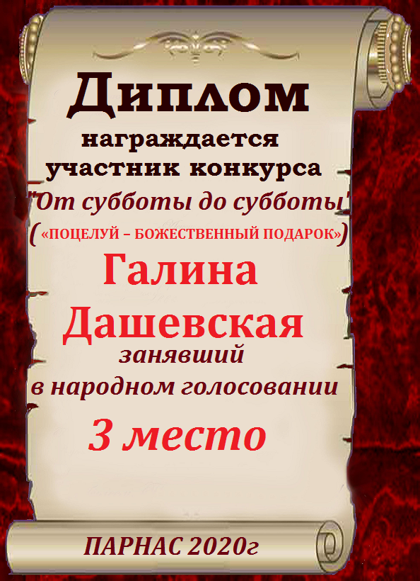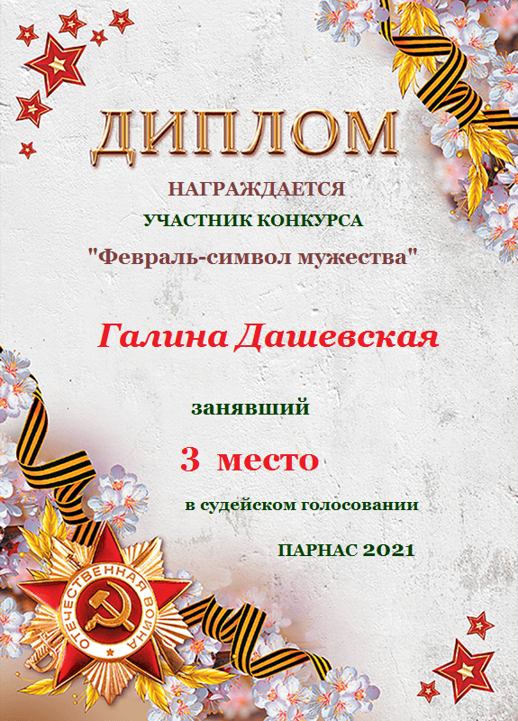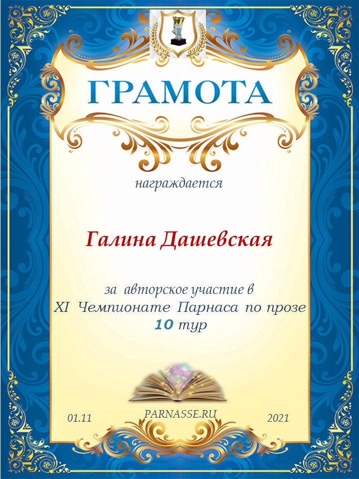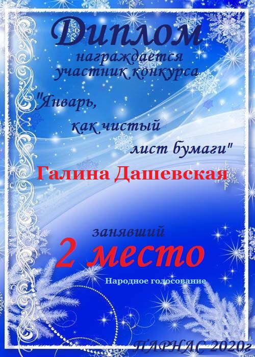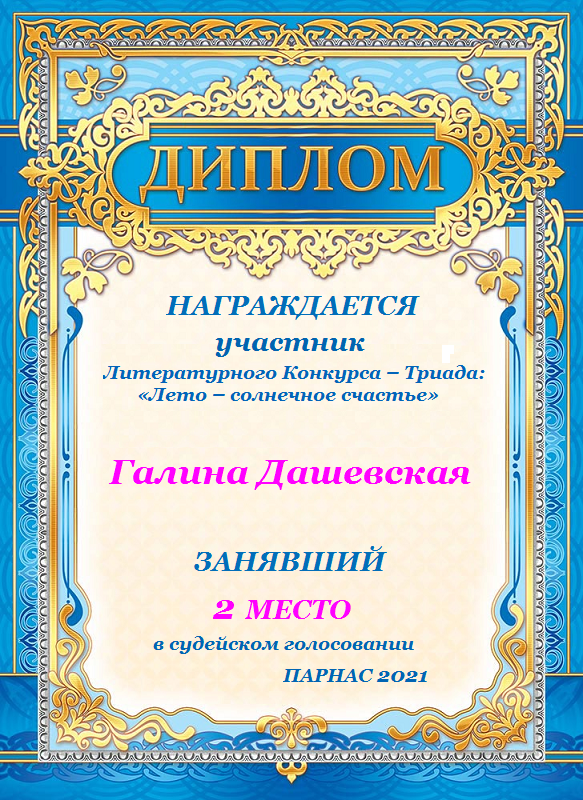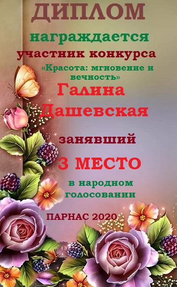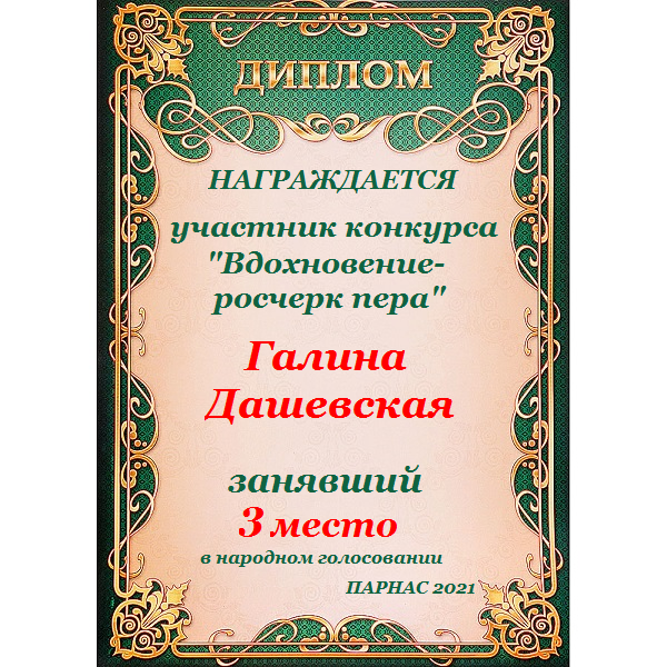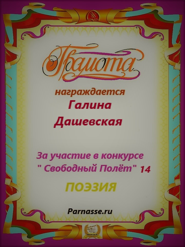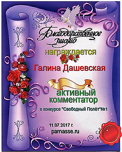 За неугасающую и неисчерпаемую творческую активность, постоянный контакт с Музой и признание сообществом "Парнасцев".От всей души желаем Вам, Галина, здоровья, любви, успехов, благополучия, удачи и творческого вдохновения!