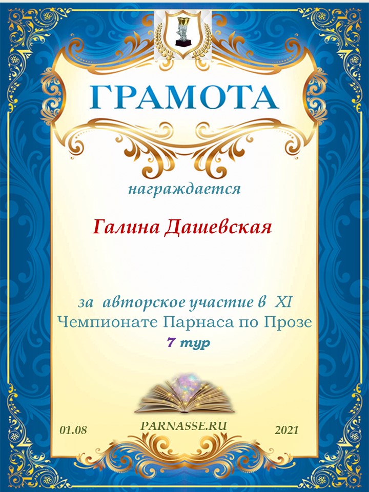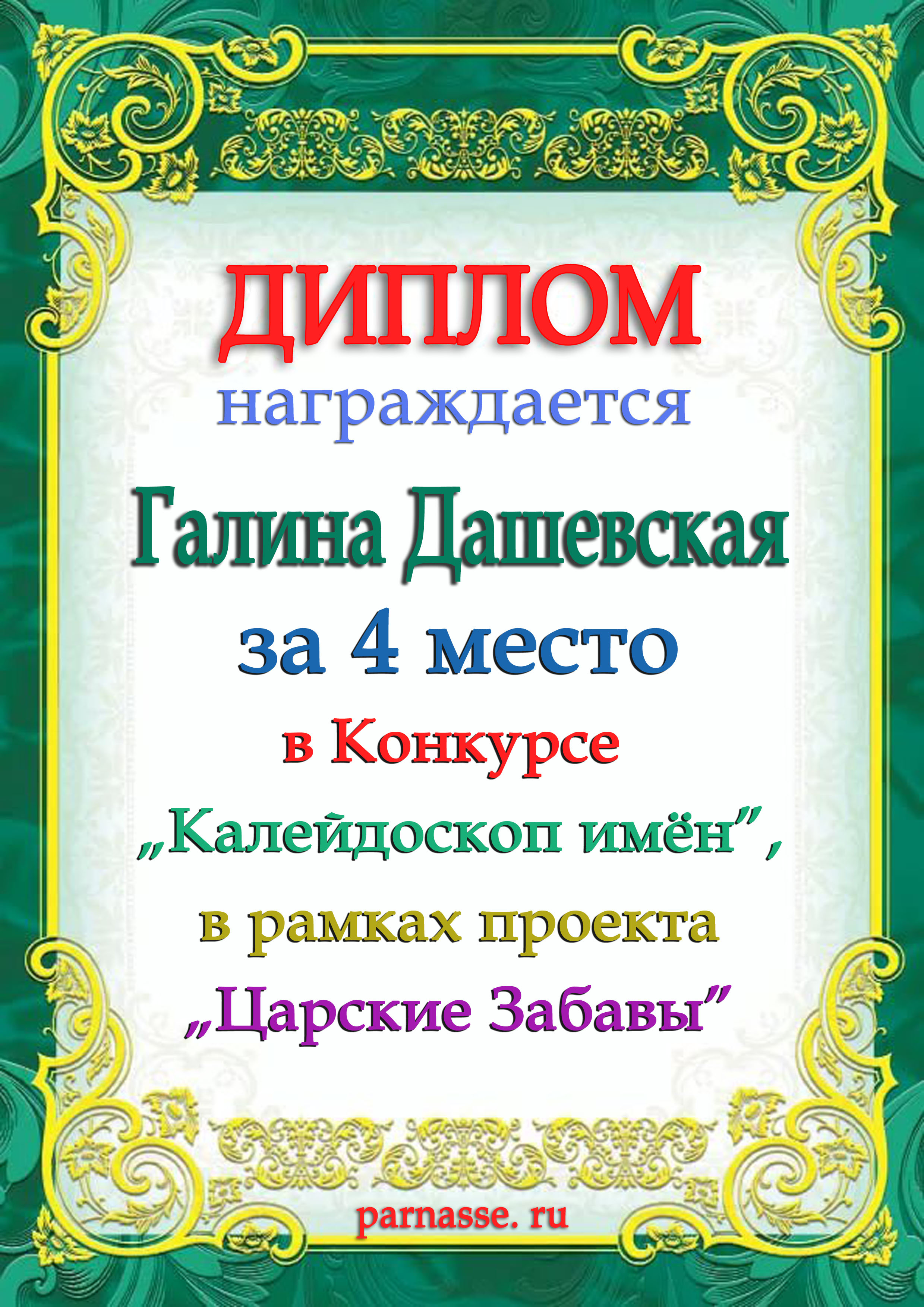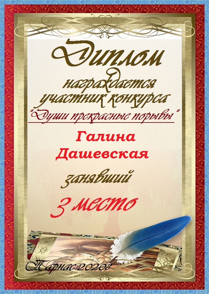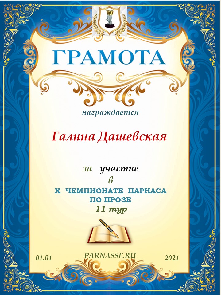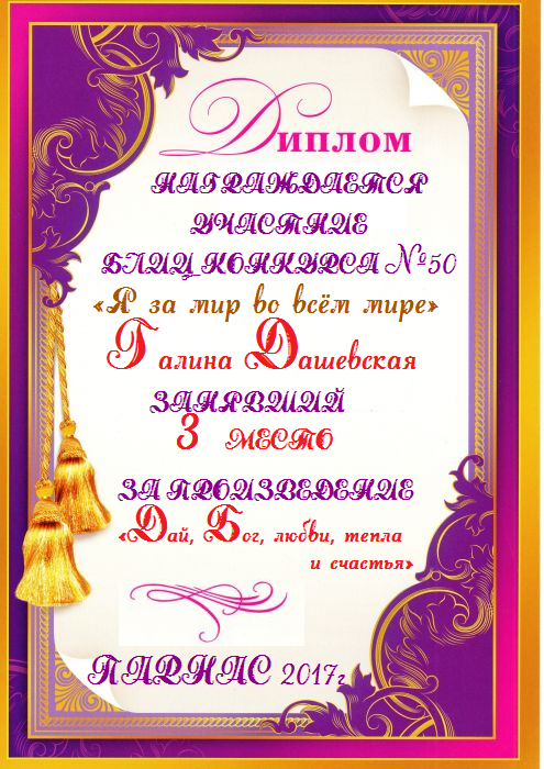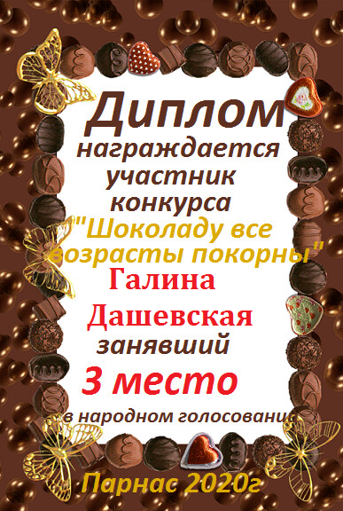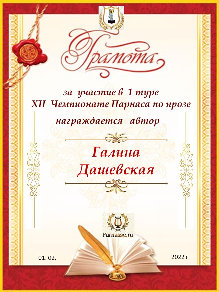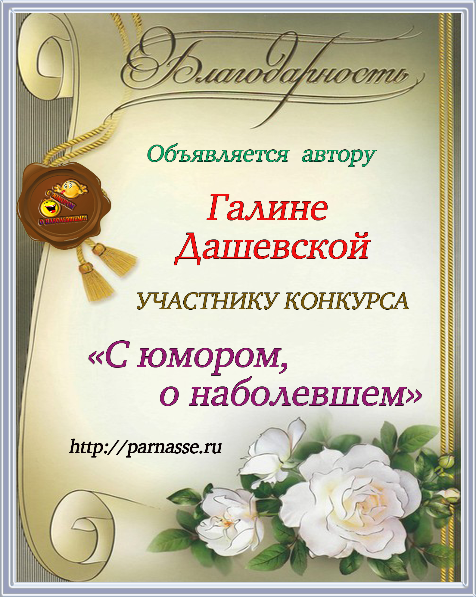 За неугасающую и неисчерпаемую творческую активность, постоянный контакт с Музой и признание сообществом "Парнасцев".От всей души желаем Вам, Галина, здоровья, любви, успехов, благополучия, удачи и творческого вдохновения!