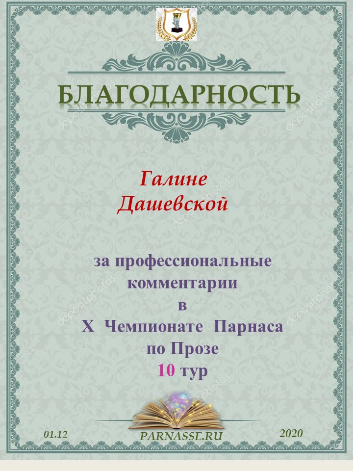 Номинация "Лучшее поздравление Парнасу в прозе".Искренне и от всего сердца благодарим Вас, ГАЛИНА, за участие в юбилейном конкурсе, за Ваши прекрасные, ярчайшие слова благодарности нашему порталу! Мы желаем Вам крепкого здоровья, жизнелюбия, творческой Музы и исполнения самых заветных желаний, которые только у Вас есть!