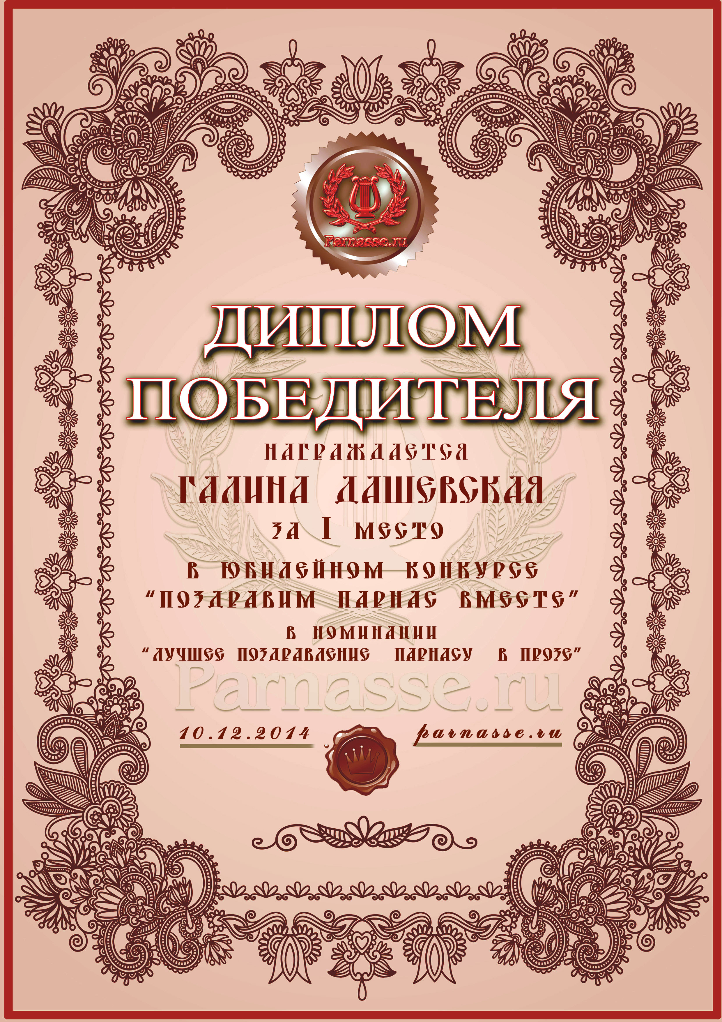 Диплом Победителя за 1 место в праздничном конкурсе "Поздравим Парнас с трёхлетием вместе!"