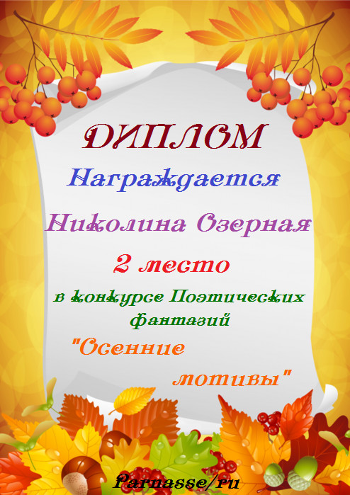 Третье место в серии ЛитКонкурсов "Литературный букет осеннего великолепия", в поэтической номинации "ПОЭЗИЯ ОСЕНИ", народное голосование. Поздравляем с прекрасной победой!