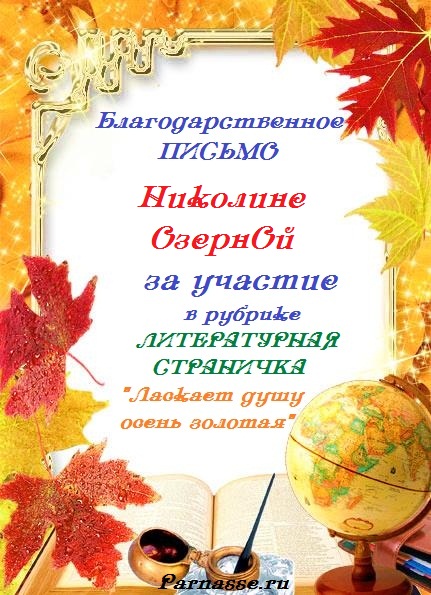 За участие в конкурсе "Октябрьский блюз листопада" в поэтической номинации "Сияет солнце золотистым перламутром". Спасибо за великолепный конкурсный стих.