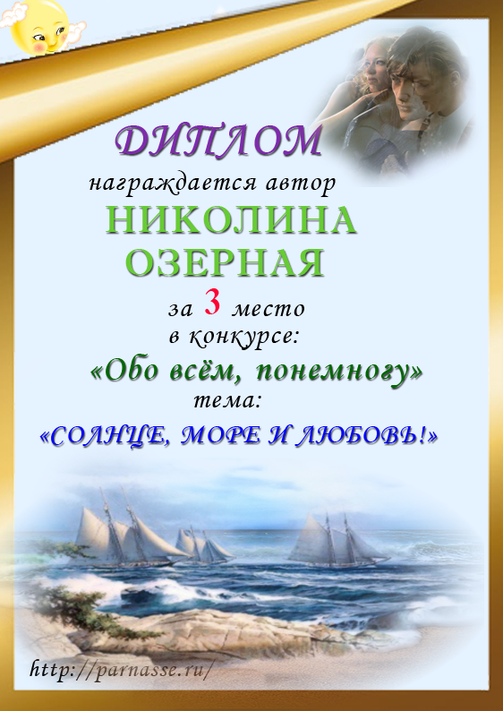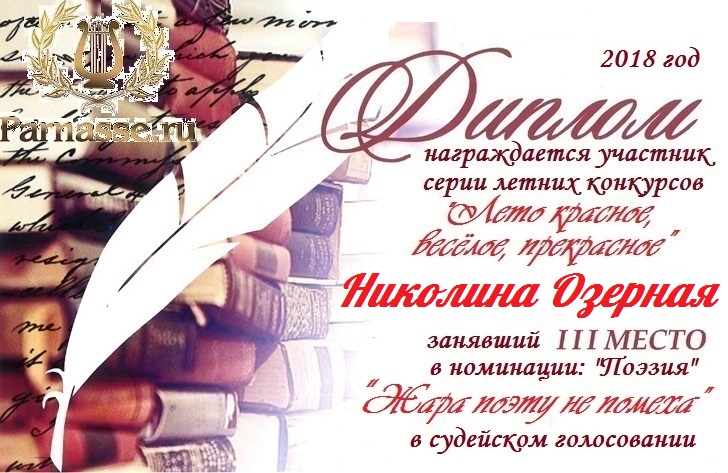 Третье место в серии летних литконкурсов "Лето красное, весёлое, прекрасное", в поэтической номинации "Жара поэту не помеха". Народное голосование. Поздравляем с победой!