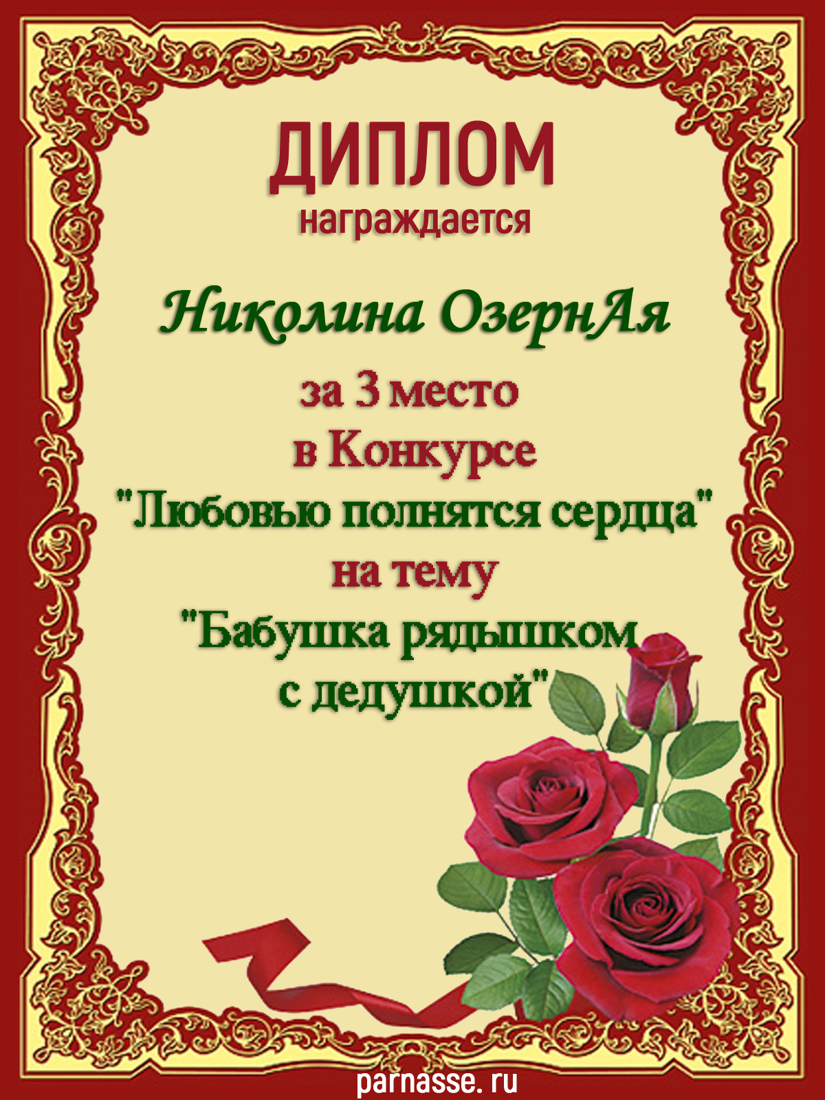 за 3 место в Конкурсе "Любовью полнятся сердца" на тему "Бабушка рядышком с дедушкой"