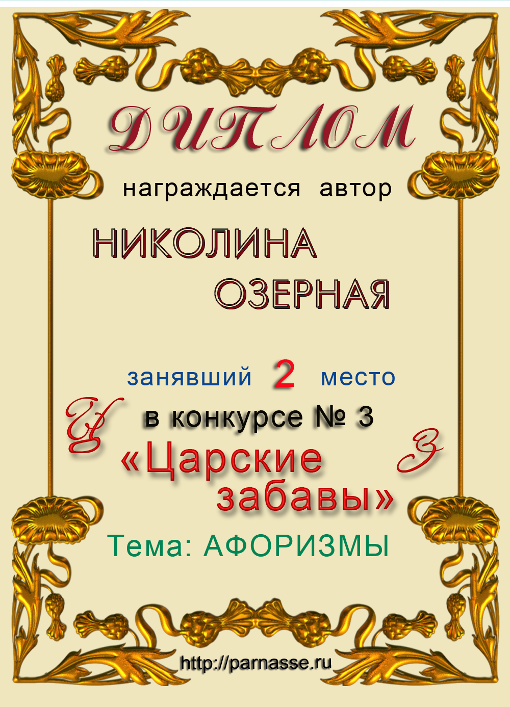 Диплом за 2 место в 114 конкурсе АКРОСТИХА (Альтернатива)! ПОЗДРАВЛЯЮ!