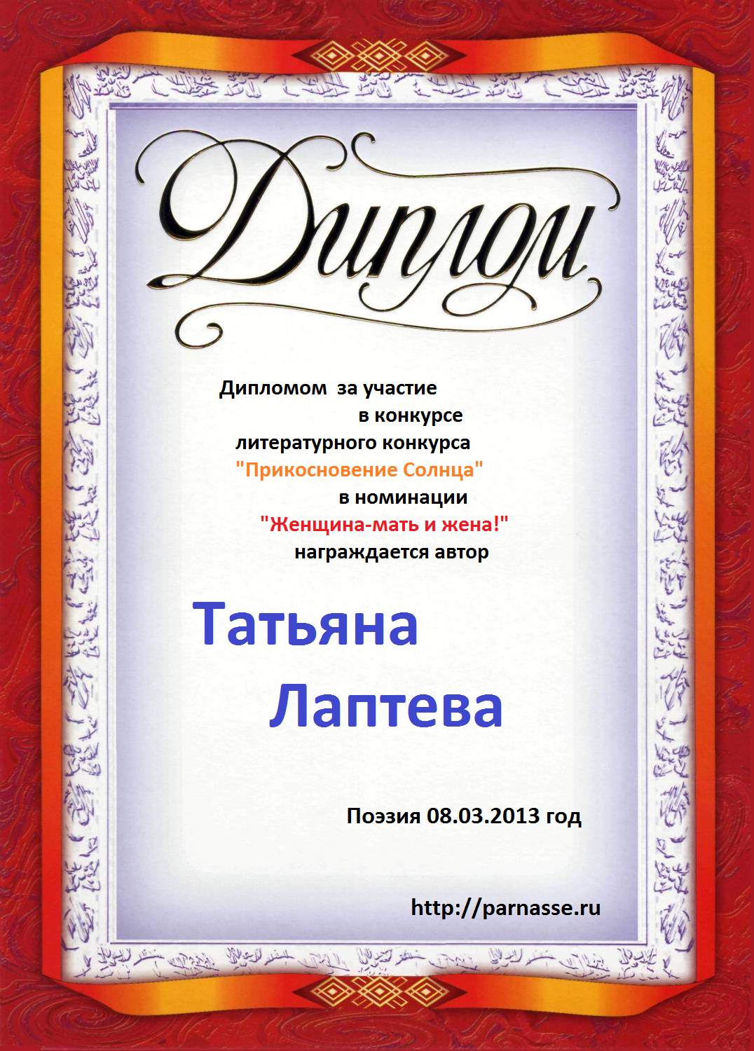 Диплом в конкурсе поэзии "Прикосновение Солнца"