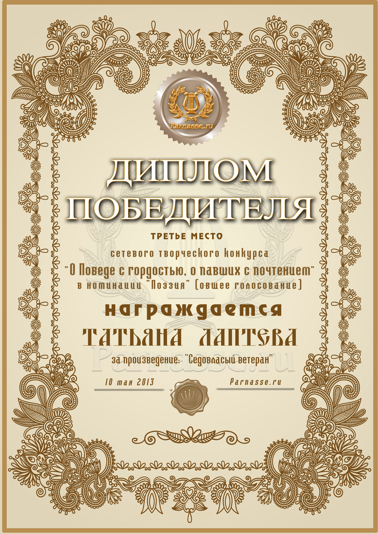 Третье место в музыкально-литературном конкурсе «О Победе с гордостью, о павших – с почтением!» Общее голосование. Номинация в поэзии «Солдаты Великой Победы»! Произведение «СЕДОВЛАСЫЙ ВЕТЕРАН»! Поздравляем с блестящей победой!