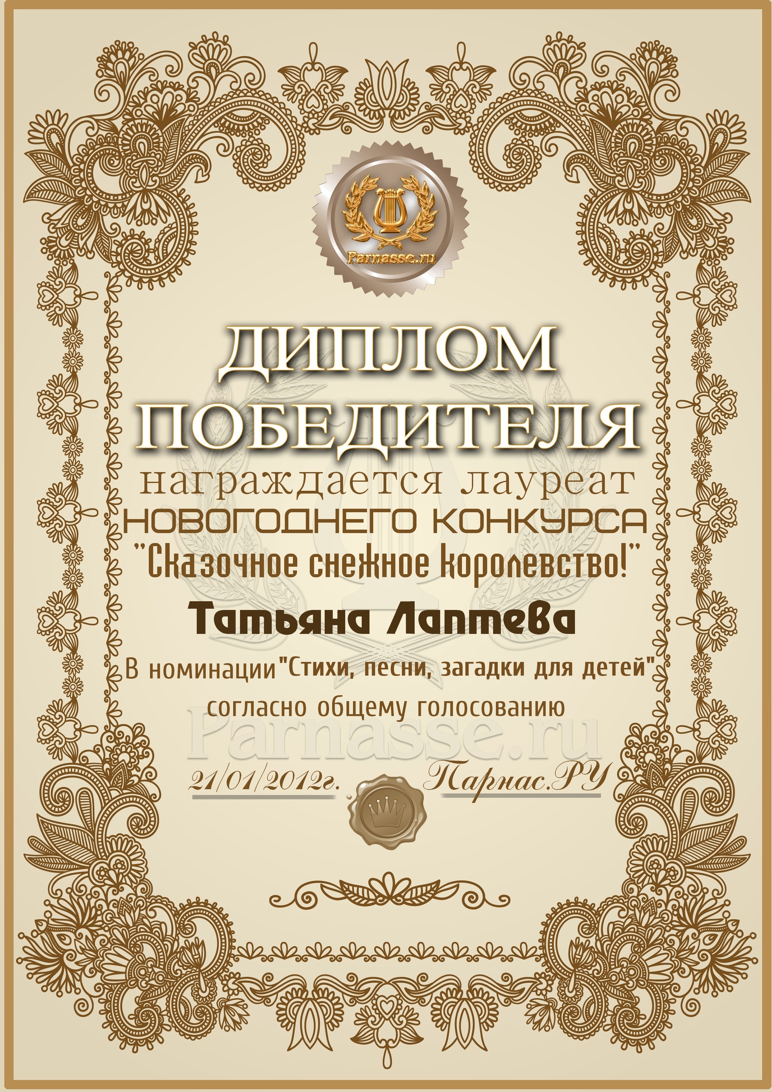 ПЕРВОЕ место в музыкально-литературном конкурсе «Зимняя сказка», в номинации «Зима и Любовь»! Произведение «Не морозь зима любимого»! Поздравляем с блестящей победой в конкурсе, Татьяна!