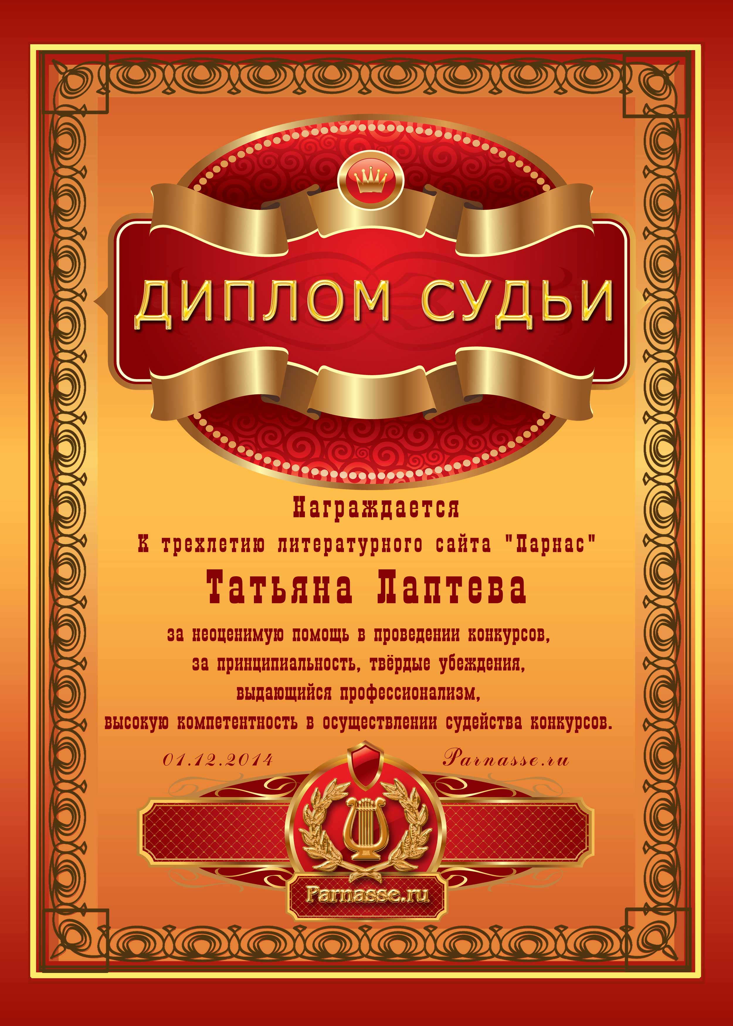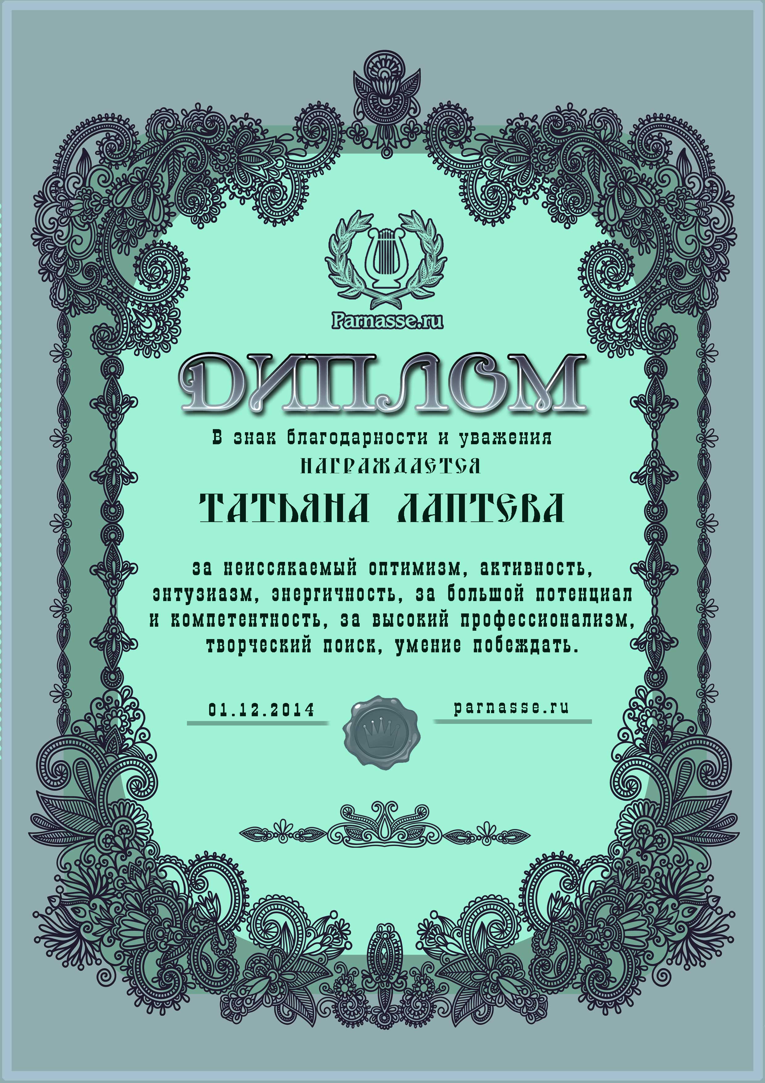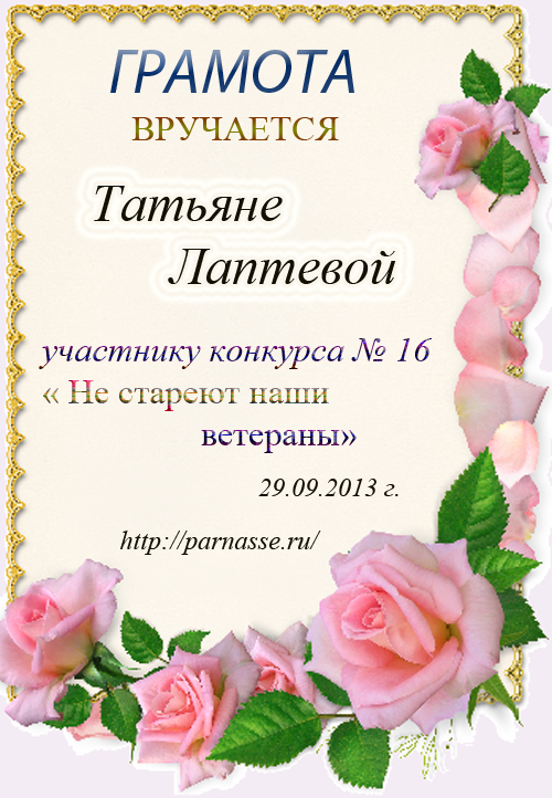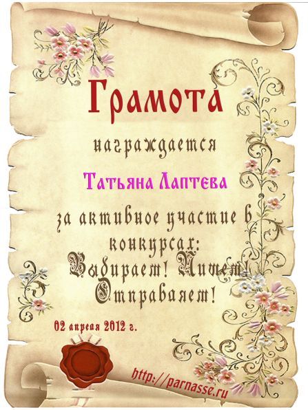 Первое место в праздничном конкурсе "Поздравим Парнас вместе!", в номинации "Лучшая поздравительная песнь Парнасу". Автор слов "Частушки про сайт "Парнас". Мы рады Вашему участию, Татьяна, в красивом конкурсе и счастливы поздравить Вас с нашим общим 3-х летним Юбилеем! Пусть удача никогда не покидает Вас, счастья Вам, крепкого здоровья и самых высоких творческих успехов! Спасибо!