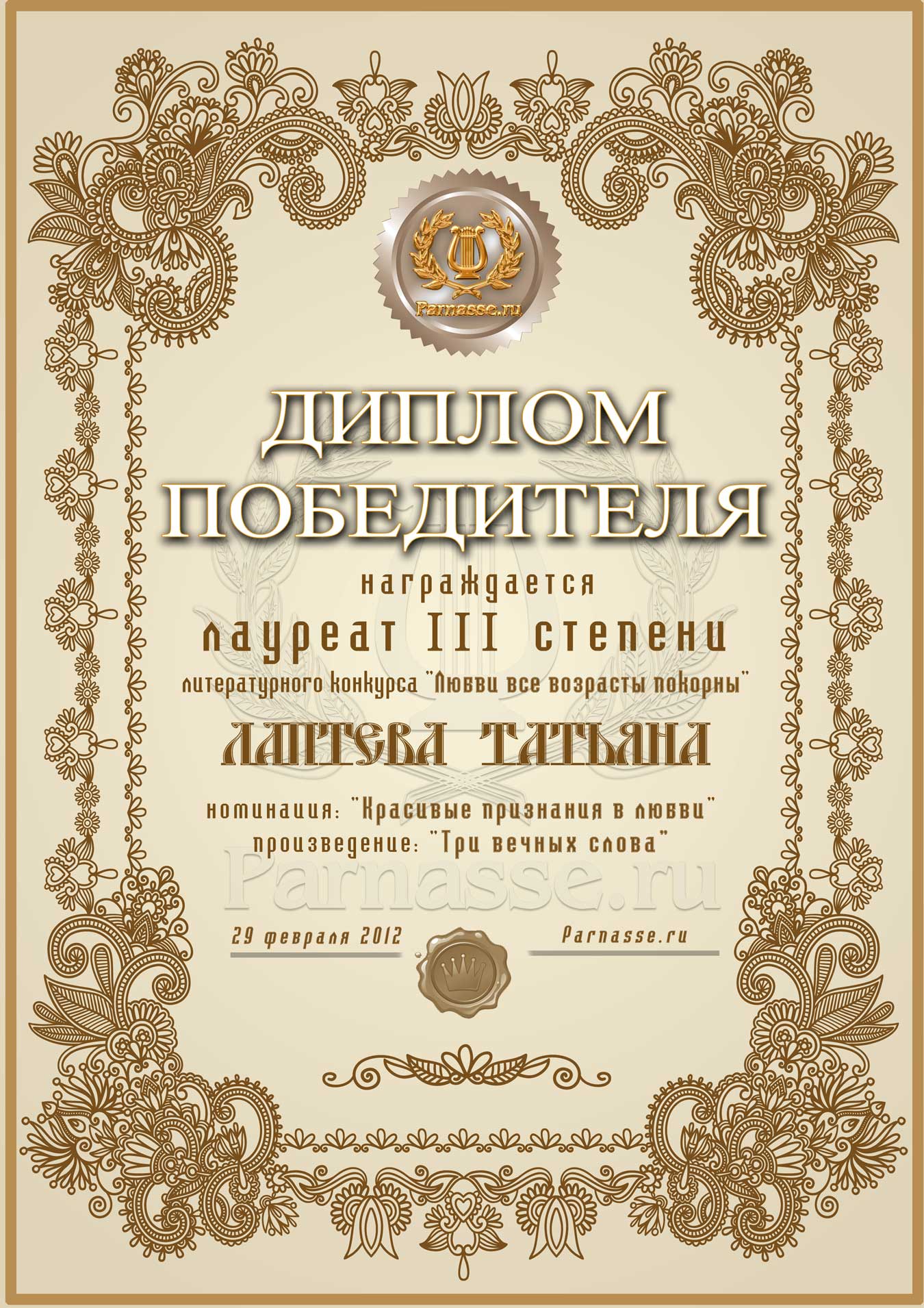 Диплом лауреата III степени лит.конкурса "Любви все возрасты покорны"