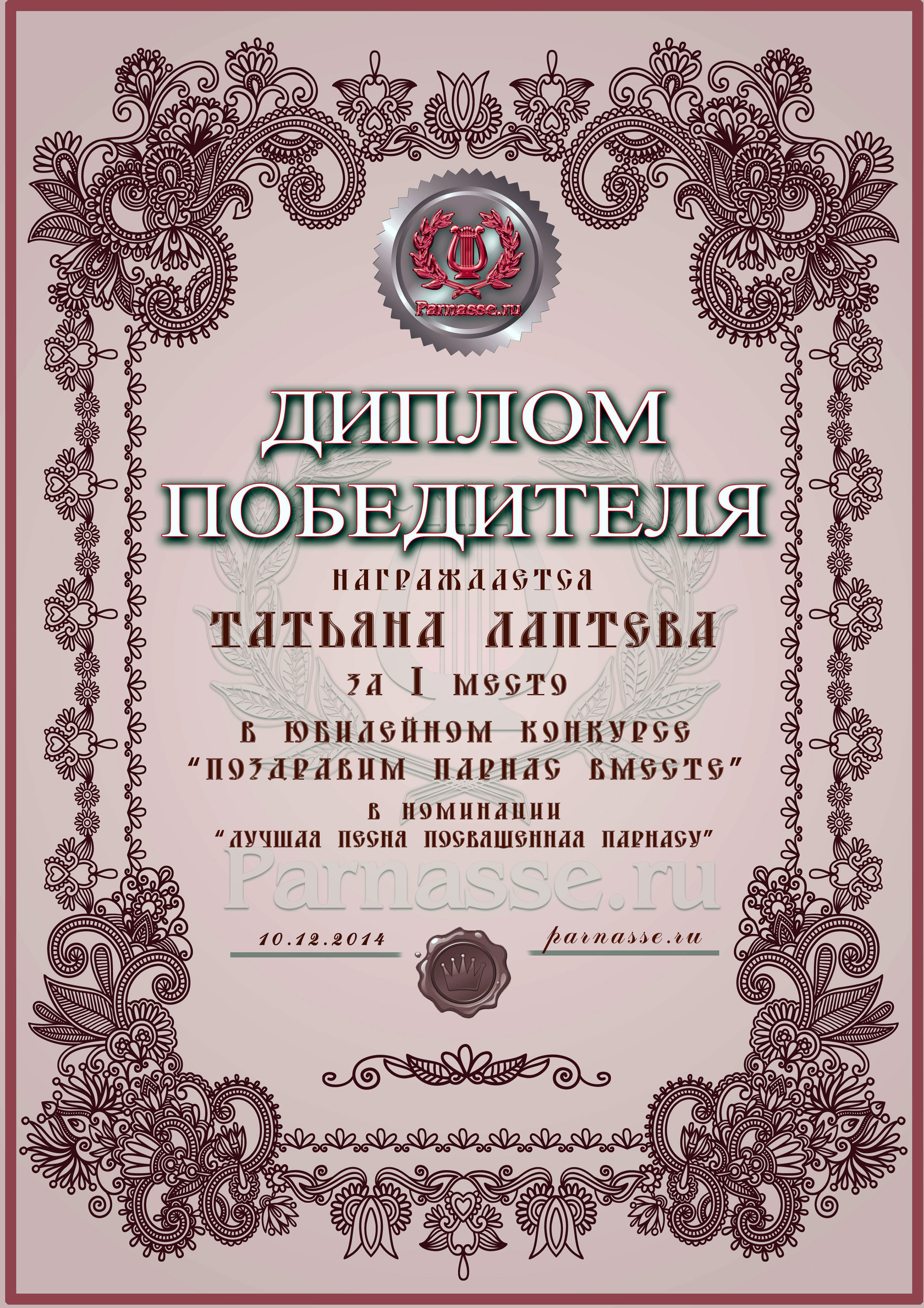 Диплом за 1 место в праздничном конкурсе "Поздравим Парнас с трёхлетием вместе!"