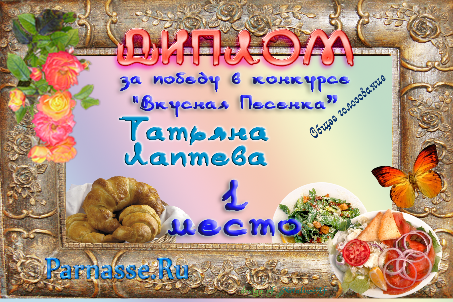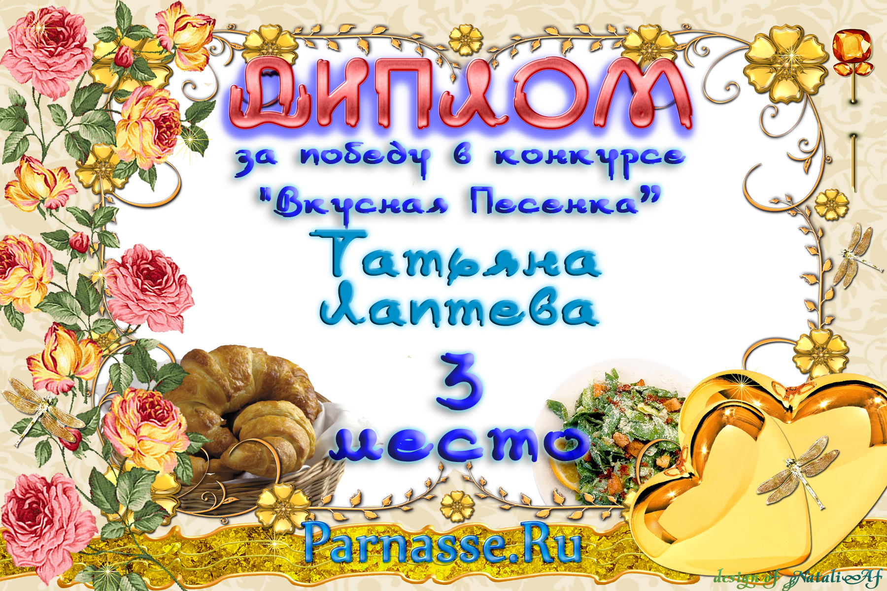 Уважаемая Татьяна!От всего сердца поздравляем Вас с блестящей ПОБЕДОЙ в номинации «Вкусная ПЕСЕНКА», во "Вкусном конкурсе"