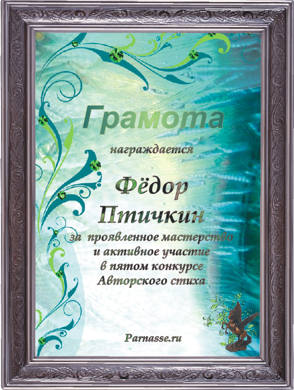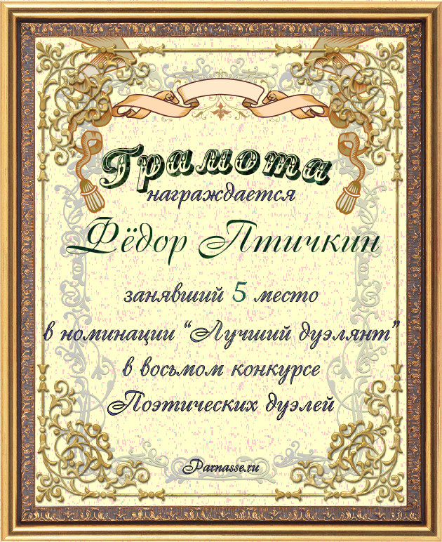 Грамота за 5-е место в номинации "Лучший дуэлянт" в восьмом конкурсе поэтических дуэлей