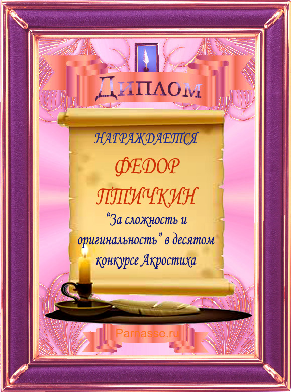 Диплом в дополнительной номинации за "Сложность и оригинальность" в 9 конкурсе АКРОСТИХА! ПОЗДРАВЛЯЮ!