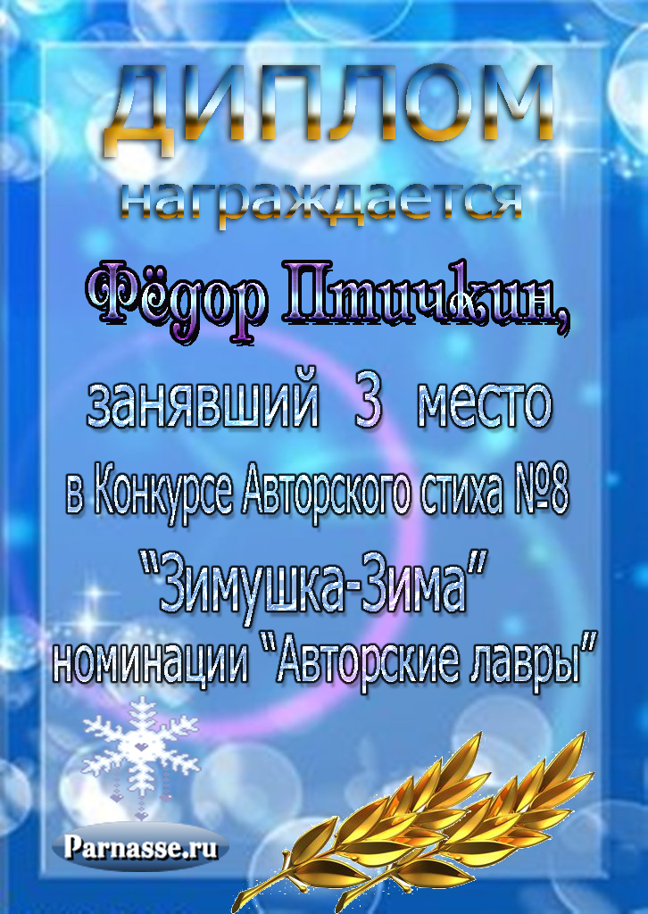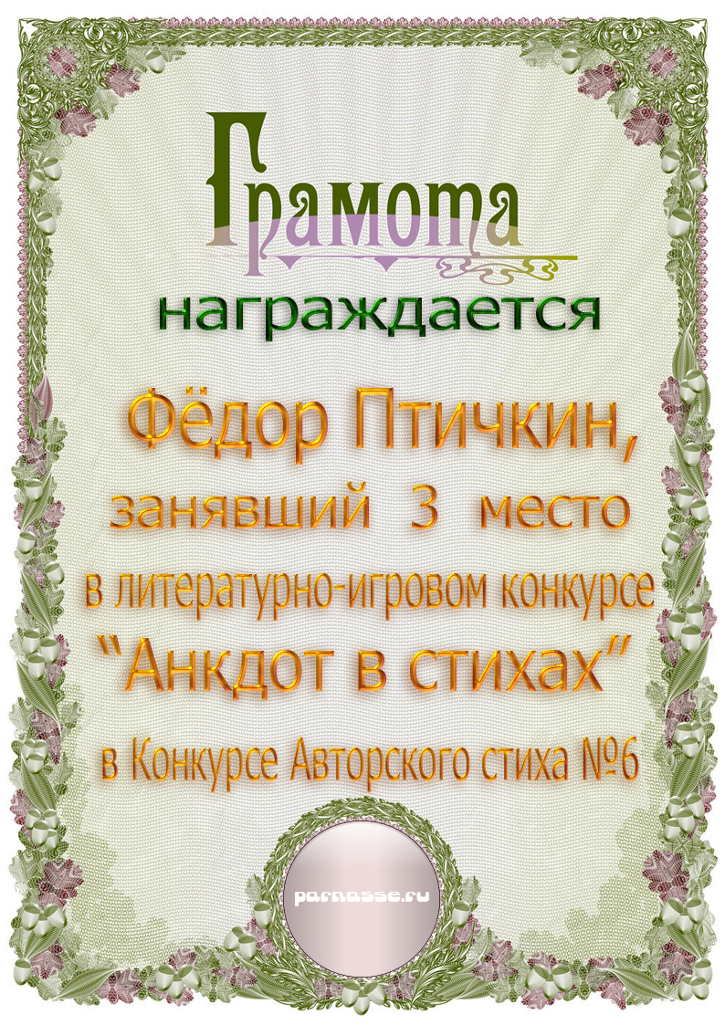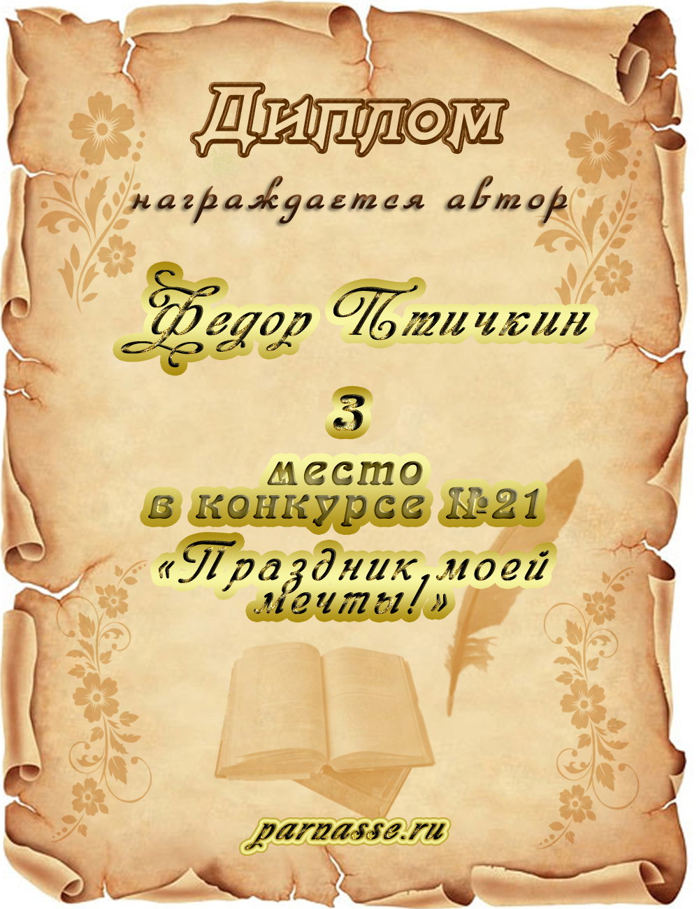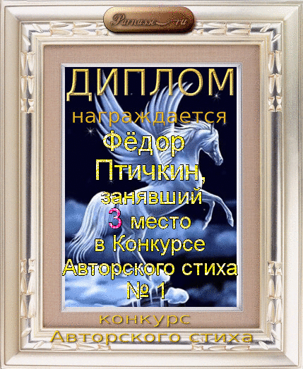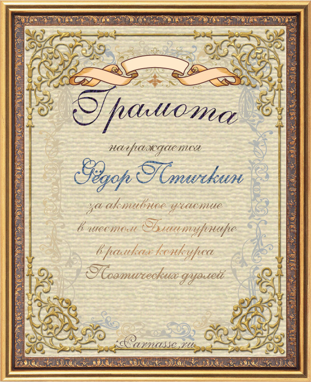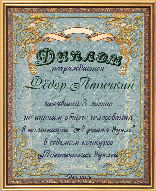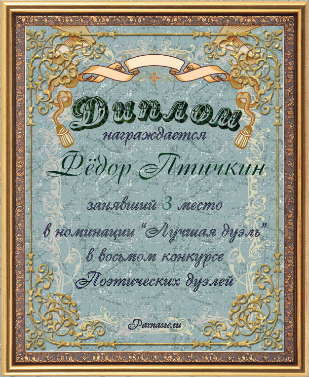 Диплом за 3-е место в номинации "Лучшая дуэль" по итогам судейского голосования в десятом конкурсе поэтических дуэлей(№ 9.2)