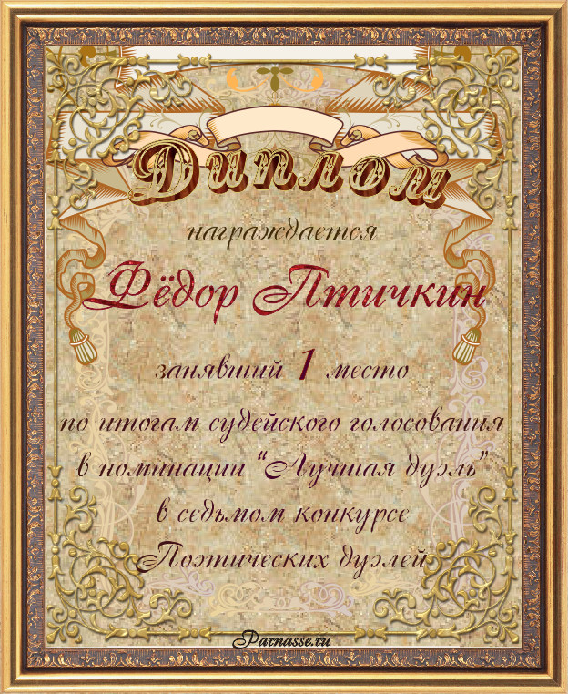 Диплом за 1-е место в номинации "Лучшая дуэль" по итогам судейского голосования в десятом конкурсе поэтических дуэлей (№ 17.4)