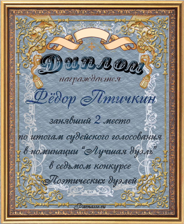 Диплом за 2-е место в номинации "Лучшая дуэль" по итогам судейского голосования в седьмом конкурсе поэтических дуэлей