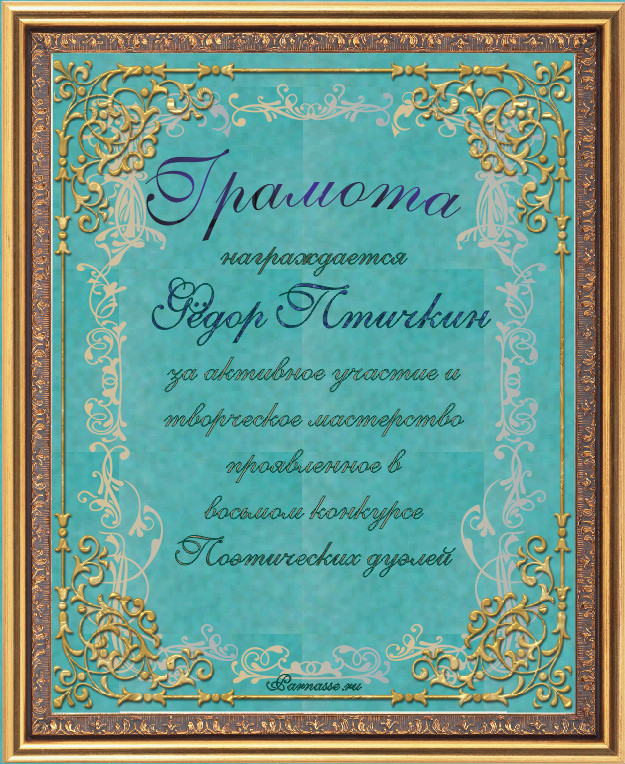 Благодарственная грамота за активное участие в восьмом конкурсе поэтических дуэлей