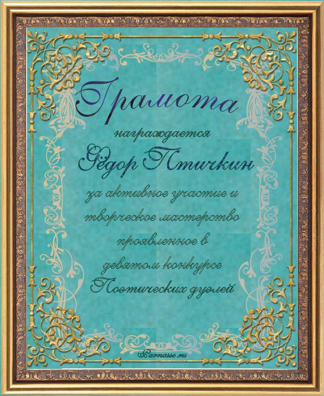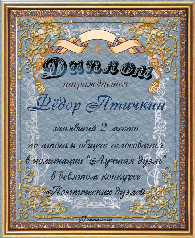 Диплом за 2-е место в номинации "Лучшая дуэль" по итогам общего голосования в девятом конкурсе поэтических дуэлей(№ 10.1)